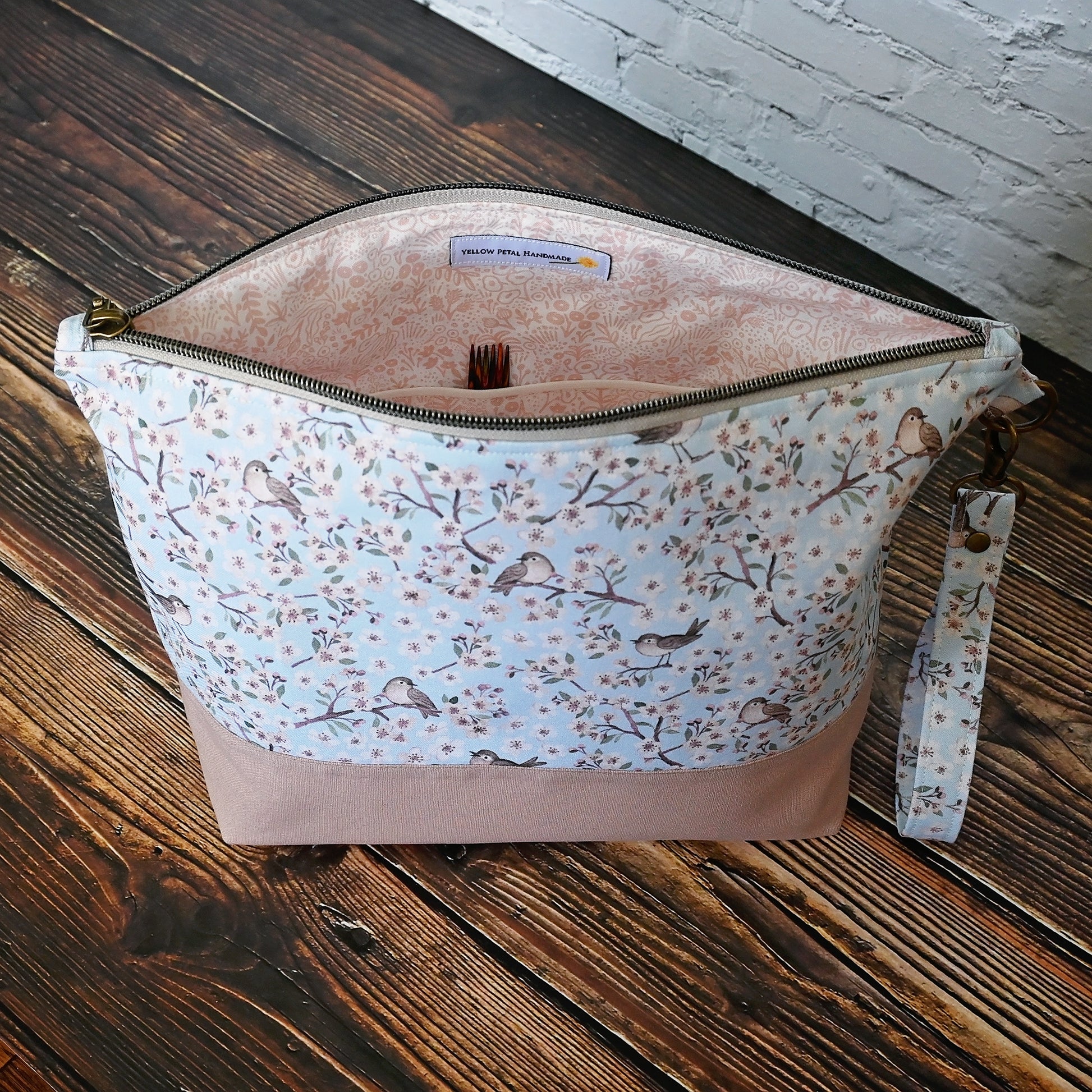These adorable bird themed cotton and linen project bags have a zipper closures and a removable wrist strap. This bag is structured to stand alone and is large enough to easily fit two skeins of yarn.