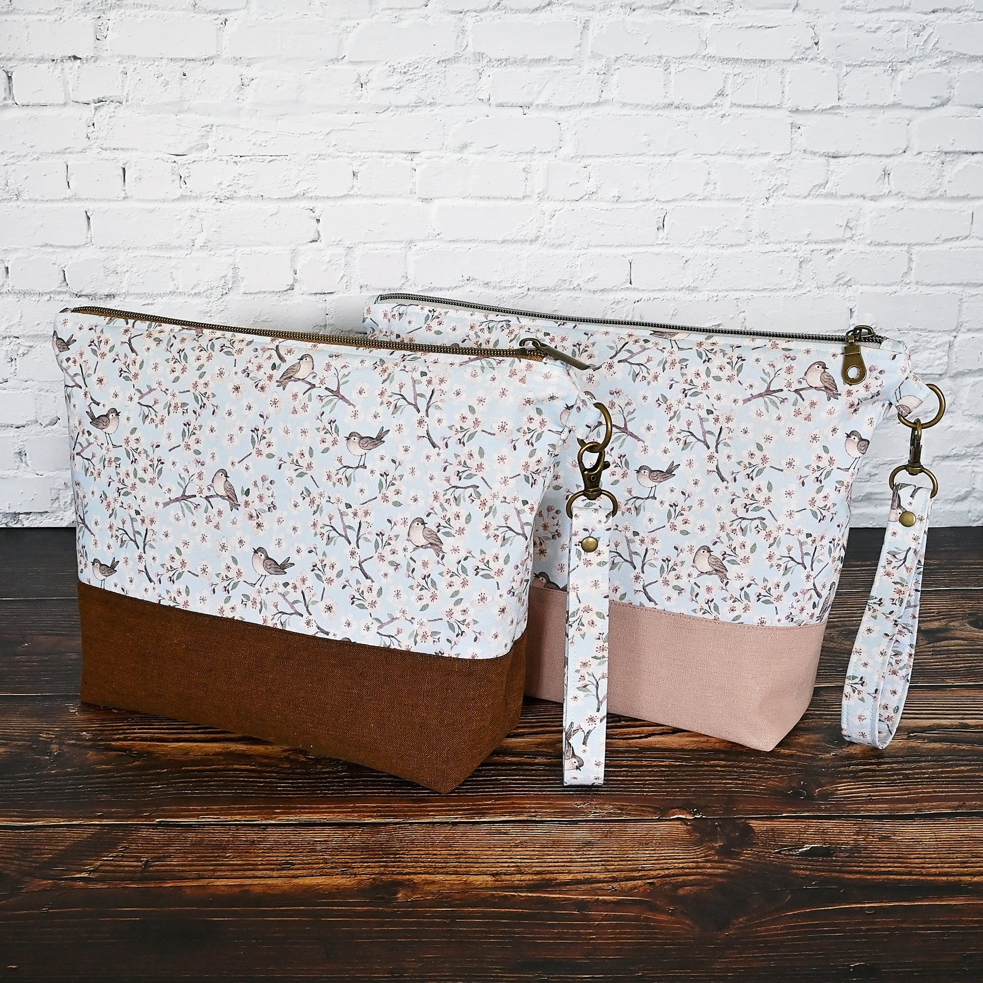 Made from the Forest Dreams fabric collection by Dear Stella and paired with your choice of a deep cinnamon or dusty rose linen from Robert Kaufman's Essex line. The interior of the cinnamon bag is a lovely blush floral cotton with white flowers, and the interior of the dusty rose bag is a soft cream with blush flowers. See photos for more detail.