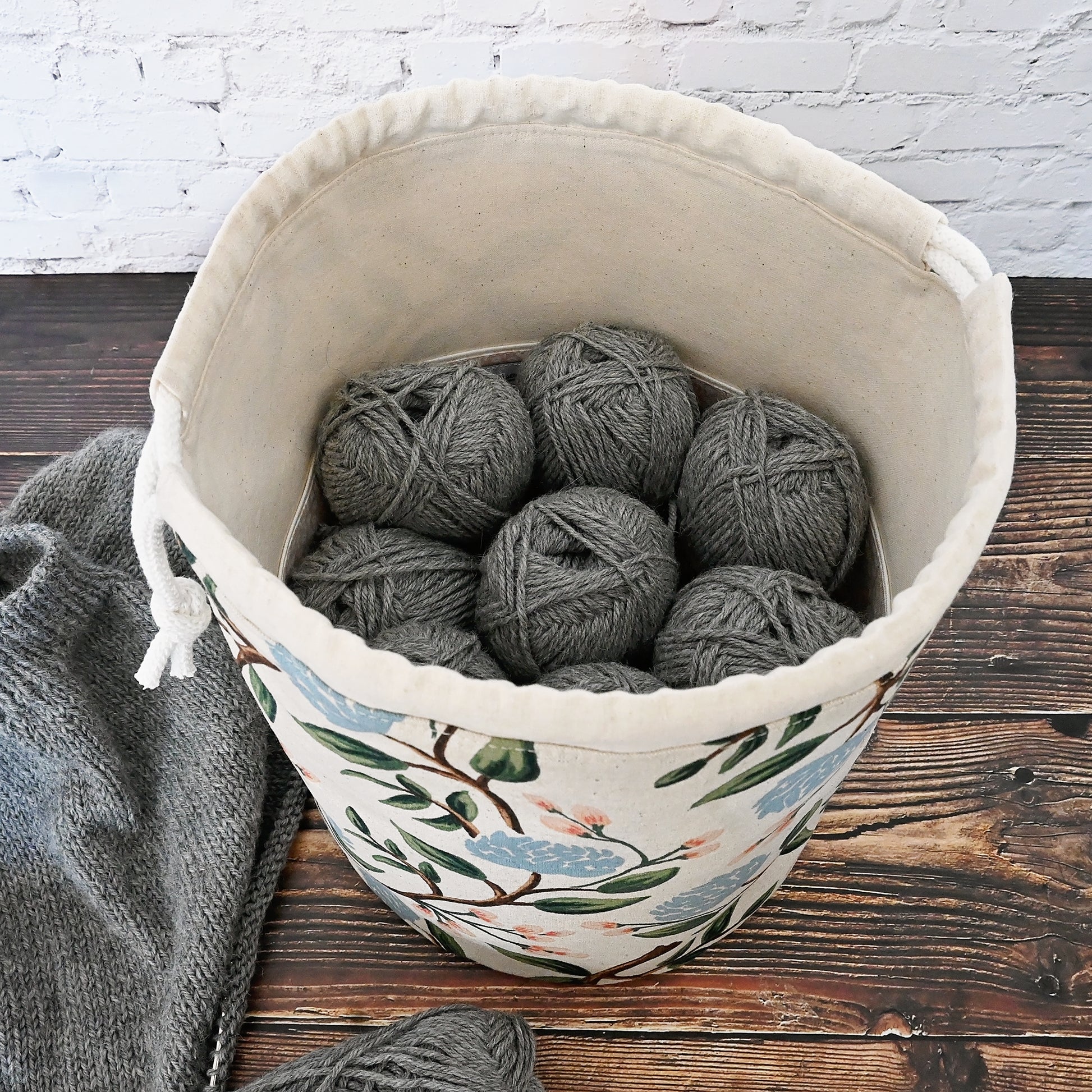 This drawstring knitting or crochet project bag is made from Rifle Paper Co's Peonies canvas. It has multiple pockets and a light layer of interfacing so that it stands alone, making it easy to reach into the bag while you're working. This bag is perfect for medium to large sized projects.