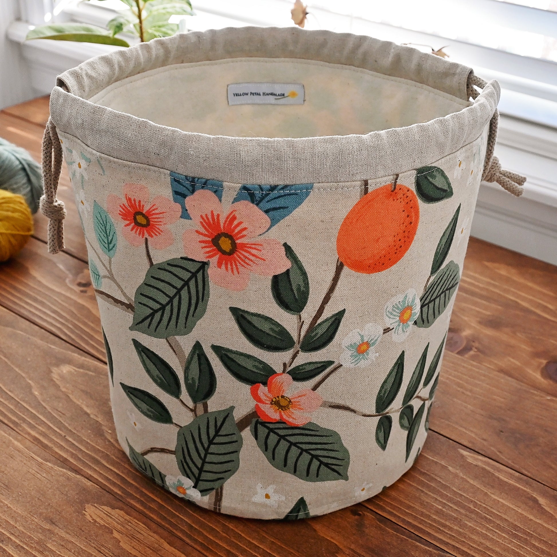 This drawstring knitting or crochet project bag is made from a gorgeous unbleached citrus canvas from the Bramble collection by Rifle Paper Co. It has multiple pockets and a light layer of interfacing so that it stands alone, making it easy to reach into the bag while you're working. This bag is perfect for medium to large sized projects.