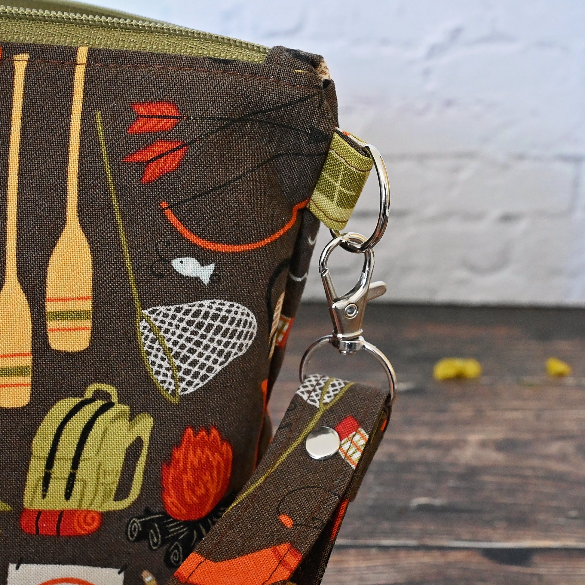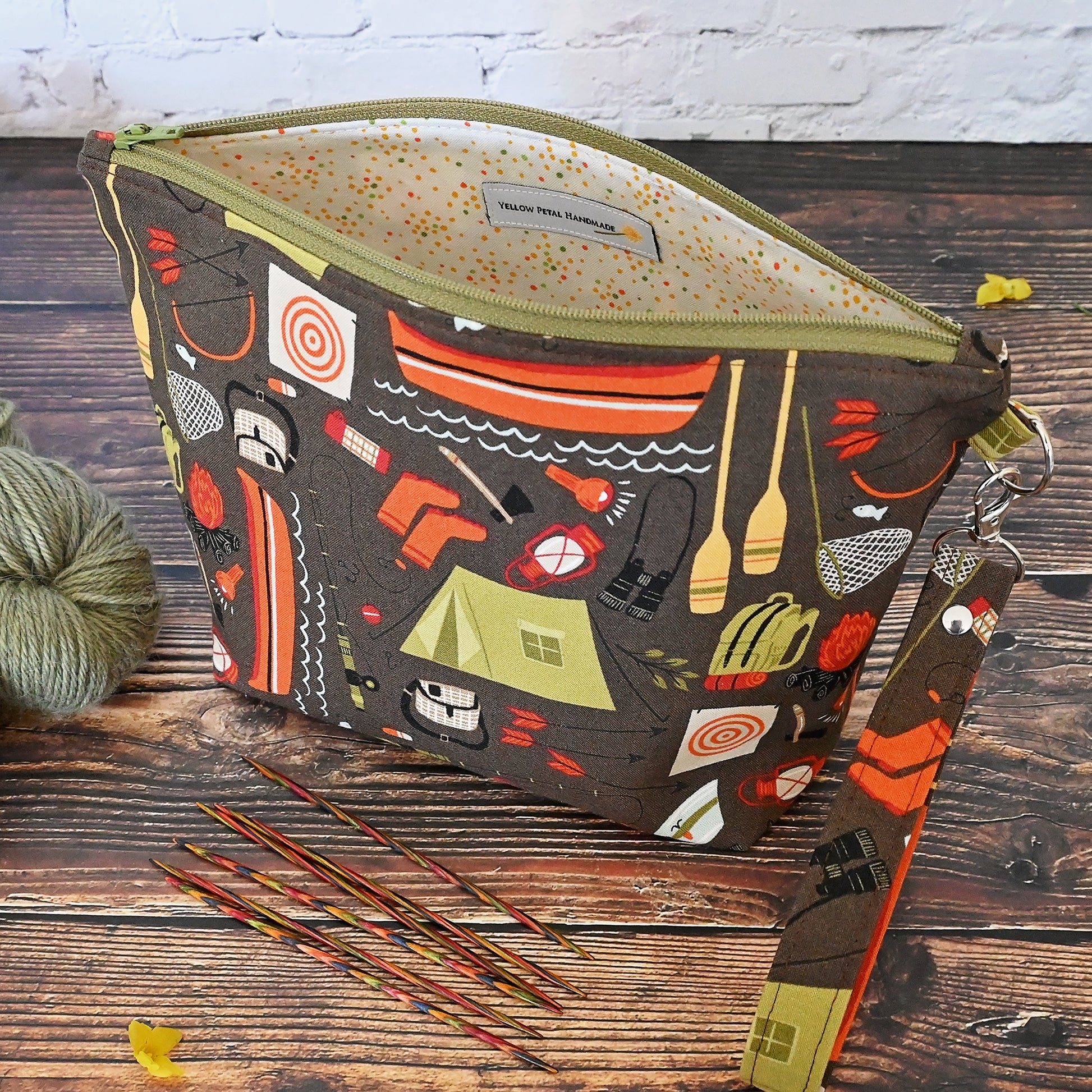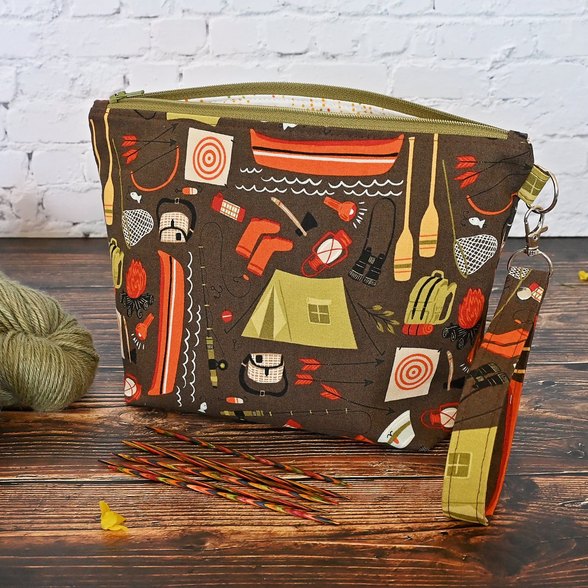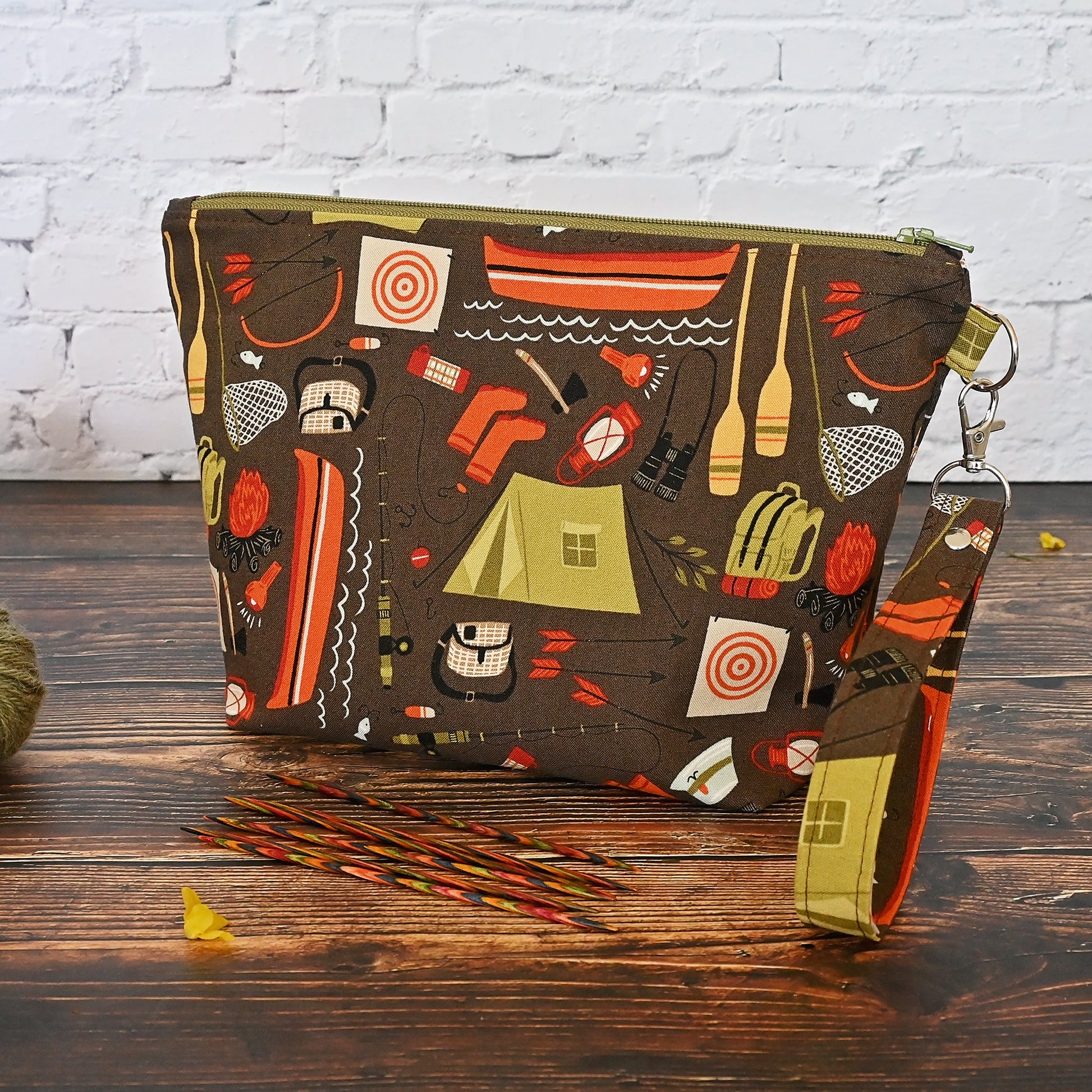 This fun pouch is made from a rich brown fabric and features  tents, canoes and all the gear for a waterside adventure!  It's a perfect size for small projects like socks or hats.  It comes with a detachable strap for easy on-the-go use.