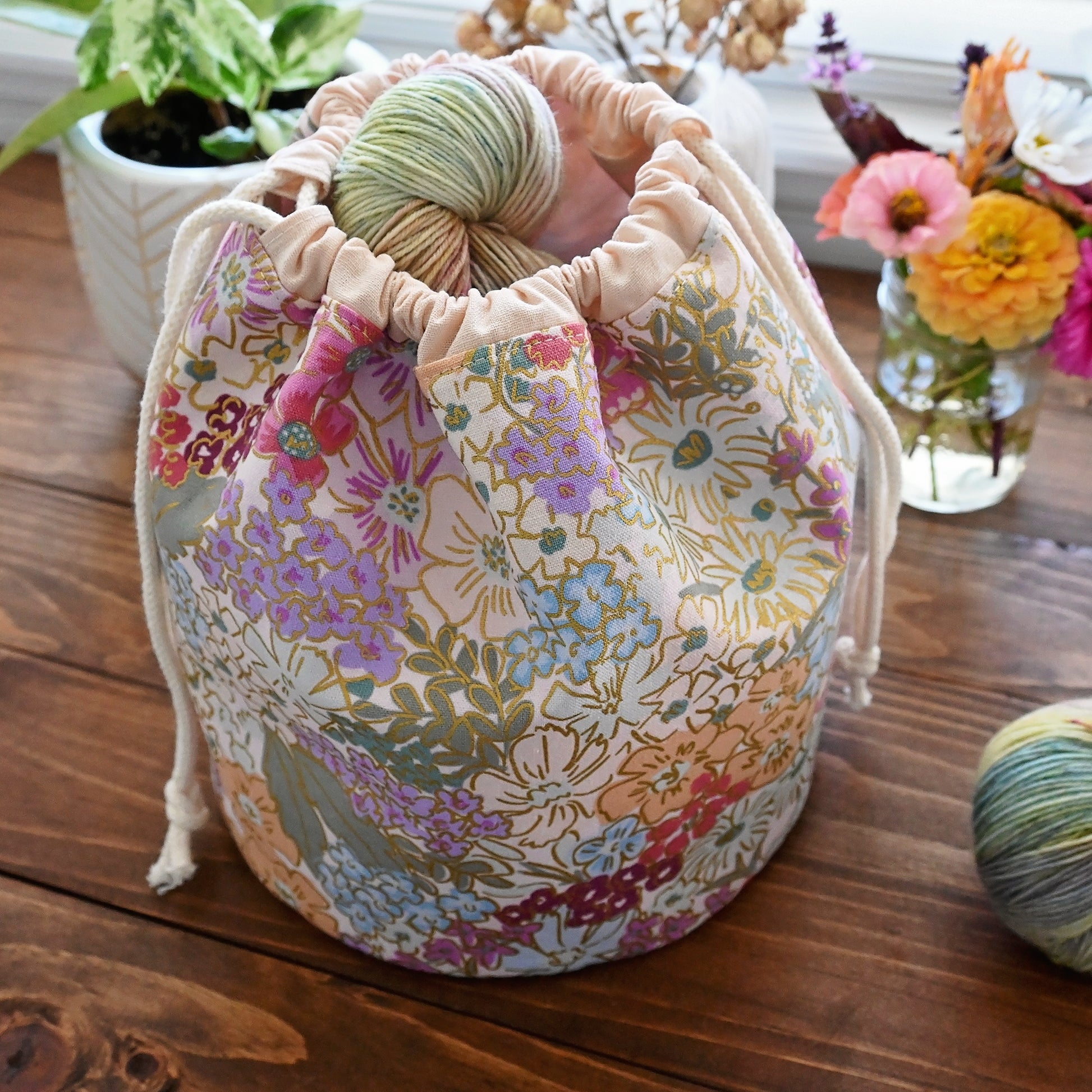 Features: This bag is lightly structured to stand on its own. It measures approximately 8.5" in diameter and 9.5" tall with a quilted base to add detail and support. It closes easily with a double drawstring.