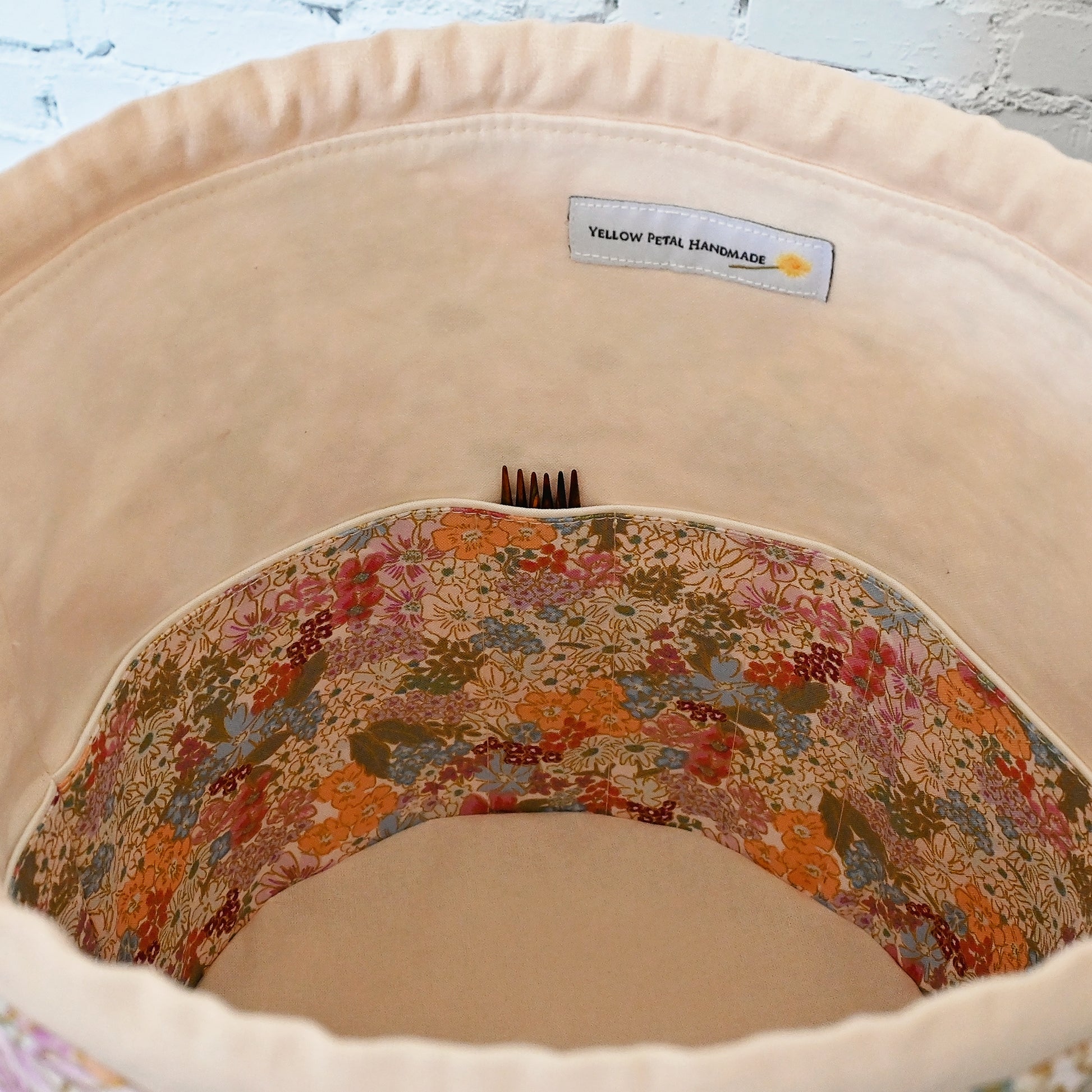 Pockets: This bag has pockets all the way around. There are six 1.25" slip pockets for DPNs or crochet hooks and it has four 4.5" pockets for circular needles or other accessories. These pockets are 4.75" deep to accommodate popular needle and hook lengths and have a lovely piping detail.