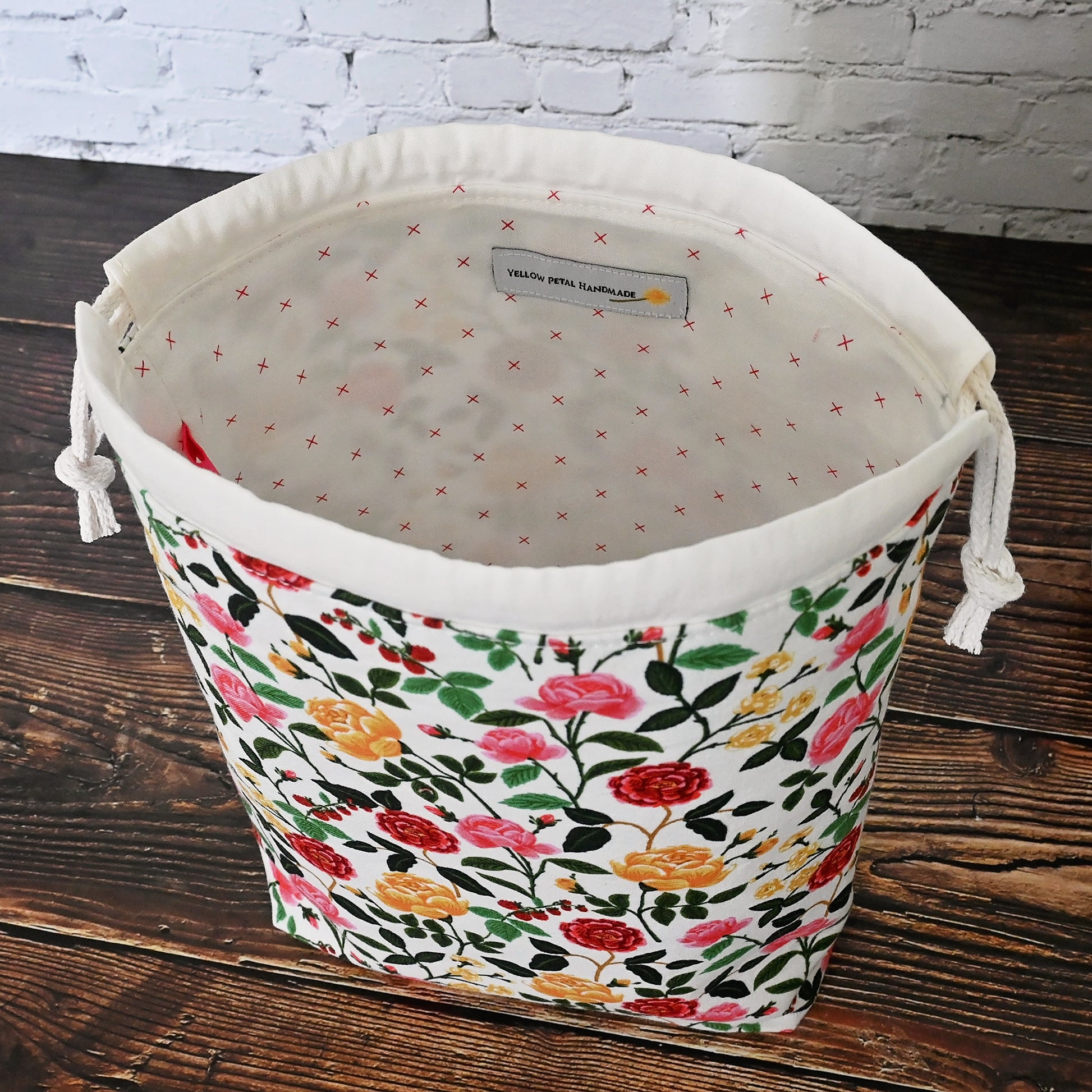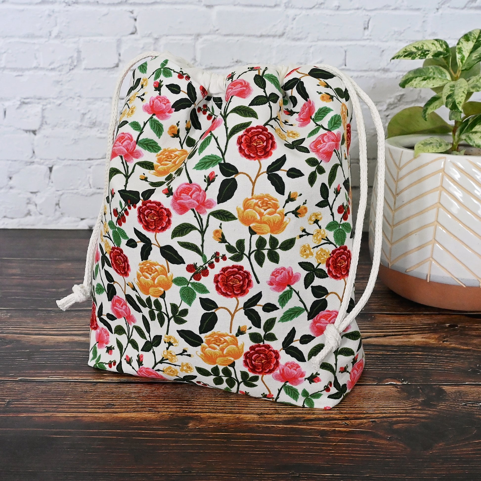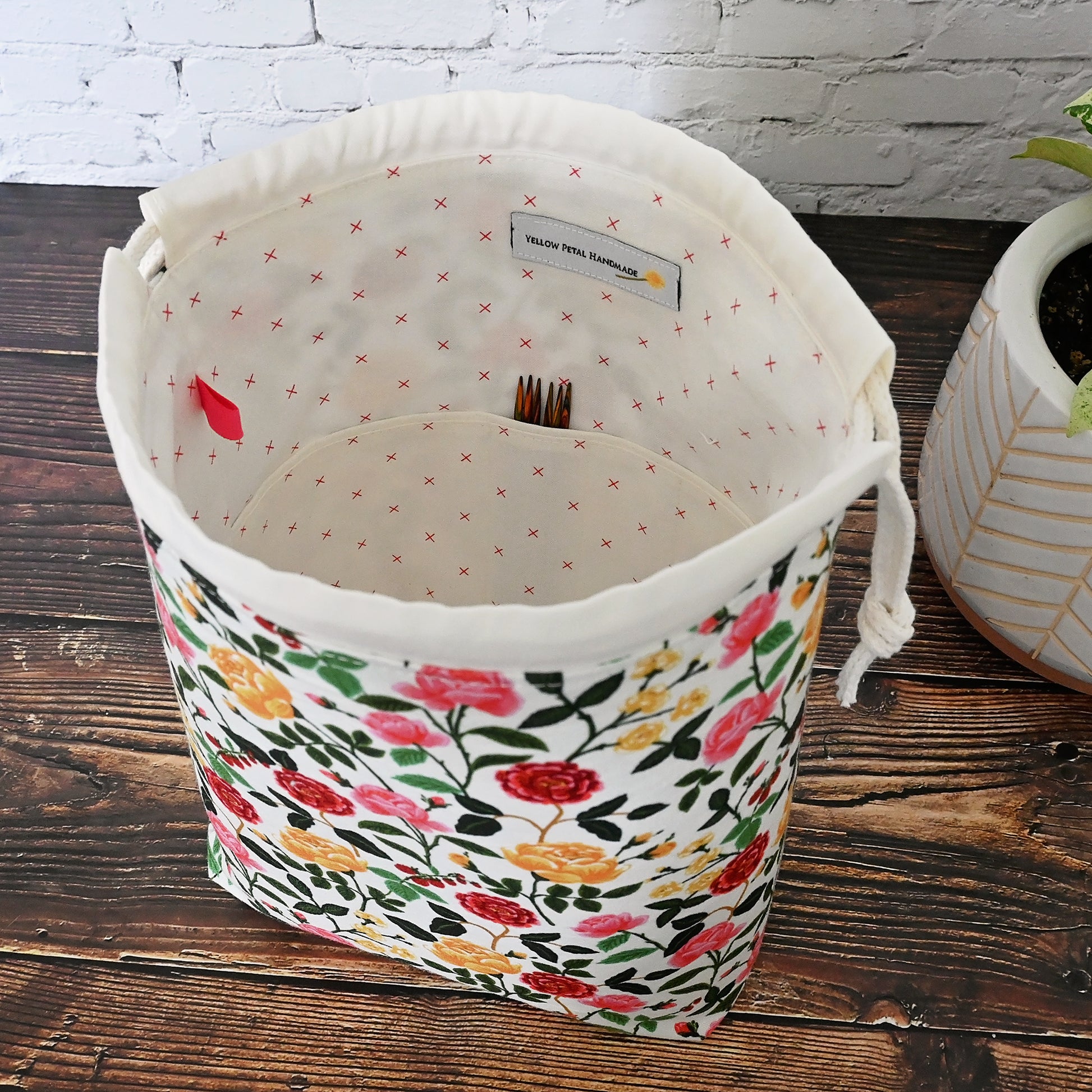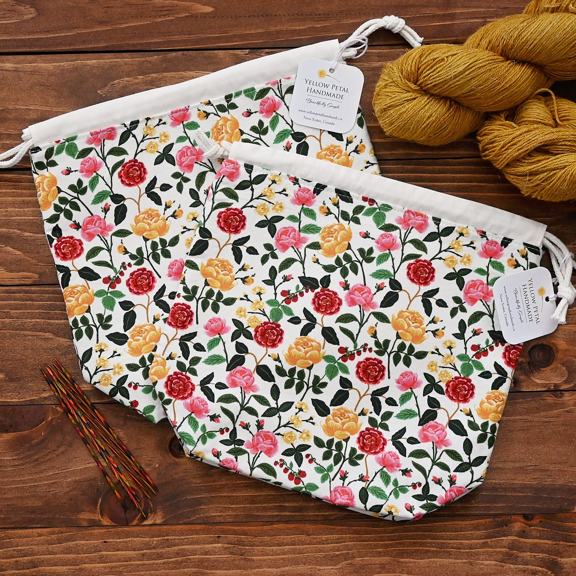 This pretty drawstring project bag is features a beautiful rose print from Rifle Paper's newest collection, English Rose.  It's lined with a fun white and pink cross stitch print. This bag is a perfect size for smaller projects and will easily fit two cakes of sock yarn.  It's lightly structured to stand alone and comes with or without pockets.