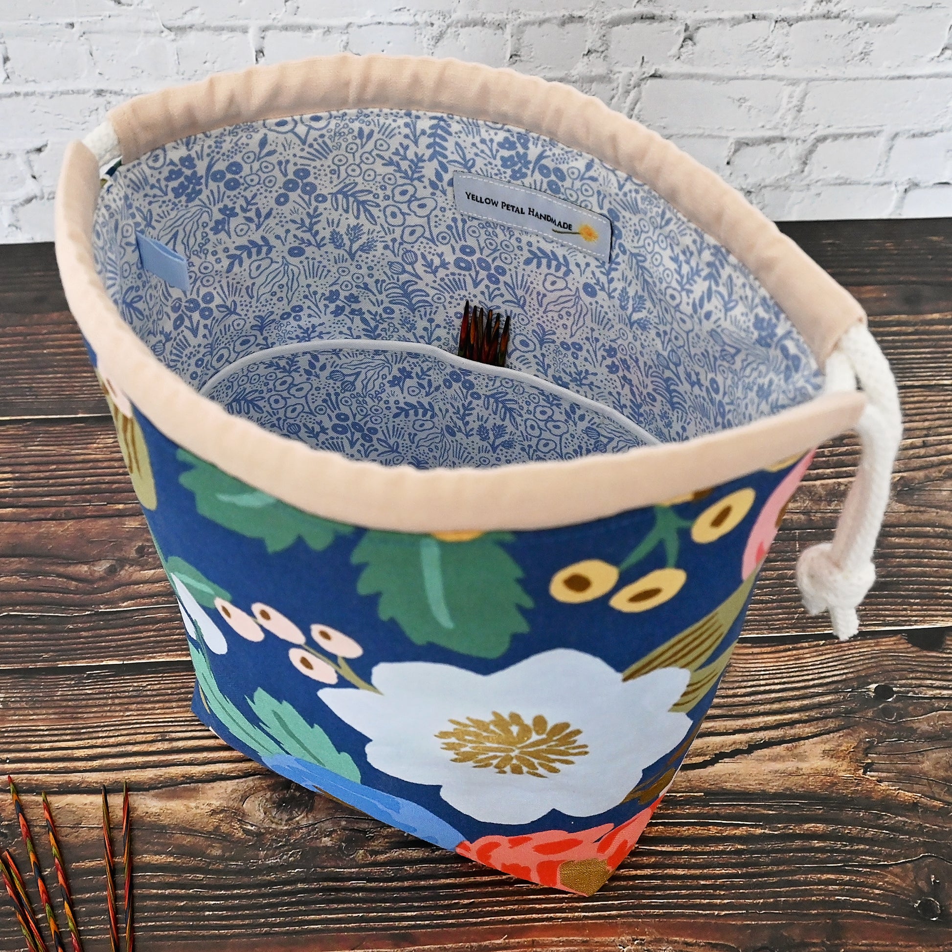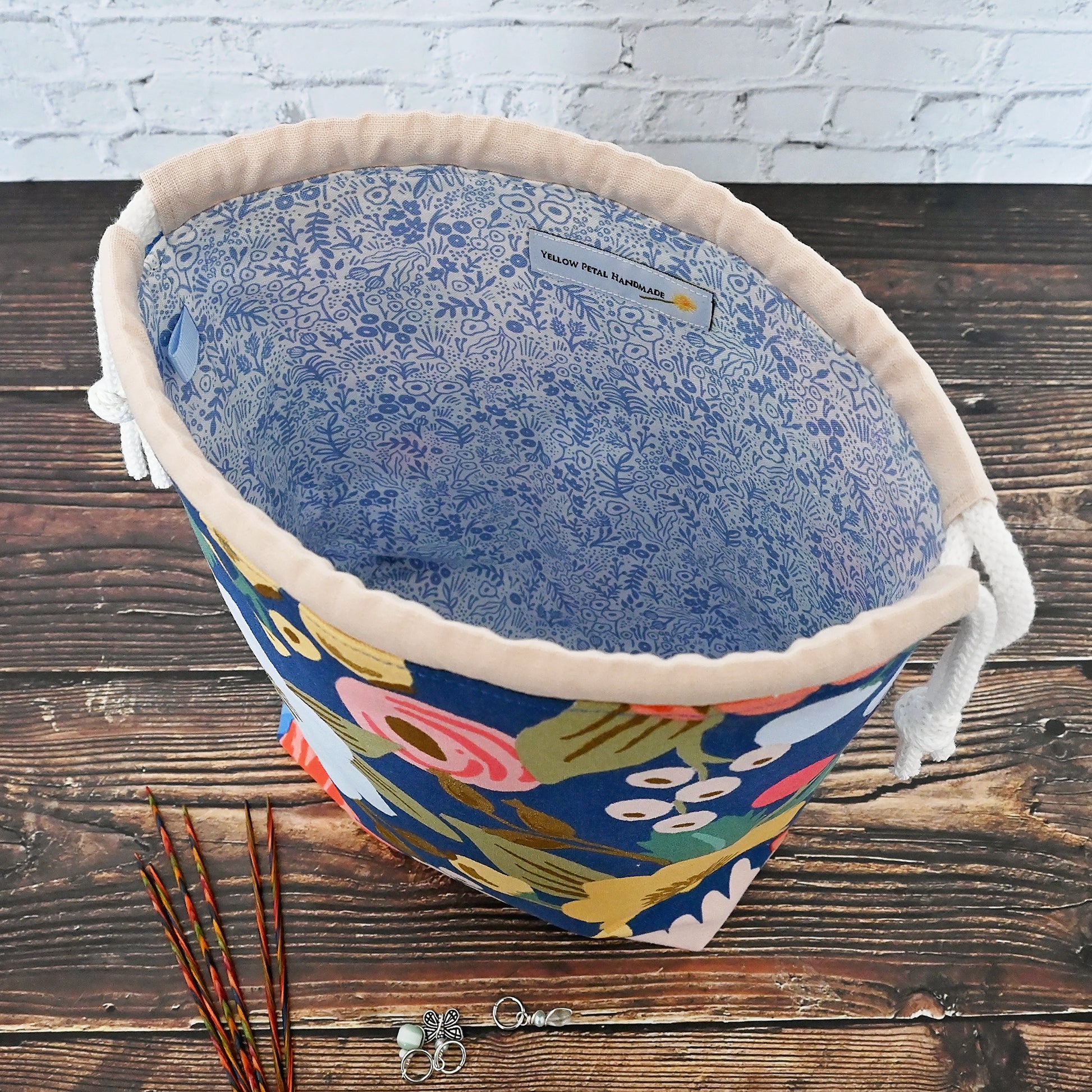 This pretty blue canvas drawstring project bag is the ideal size for smaller projects like socks, hats or cowls.  It's crafted from a striking fabric by Rifle Paper Co and features a lovely perwinkle floral lining, also from Rifle Paper.
