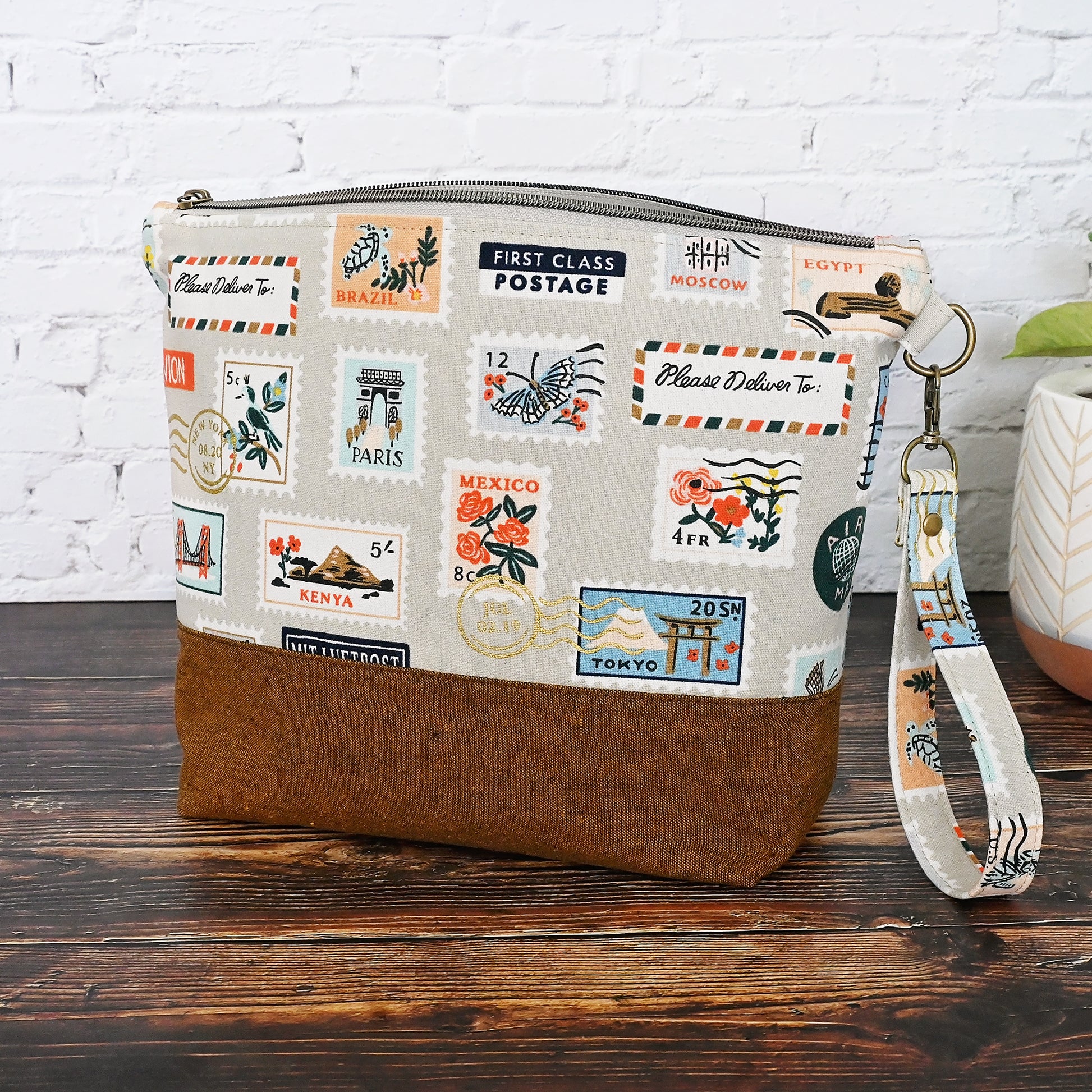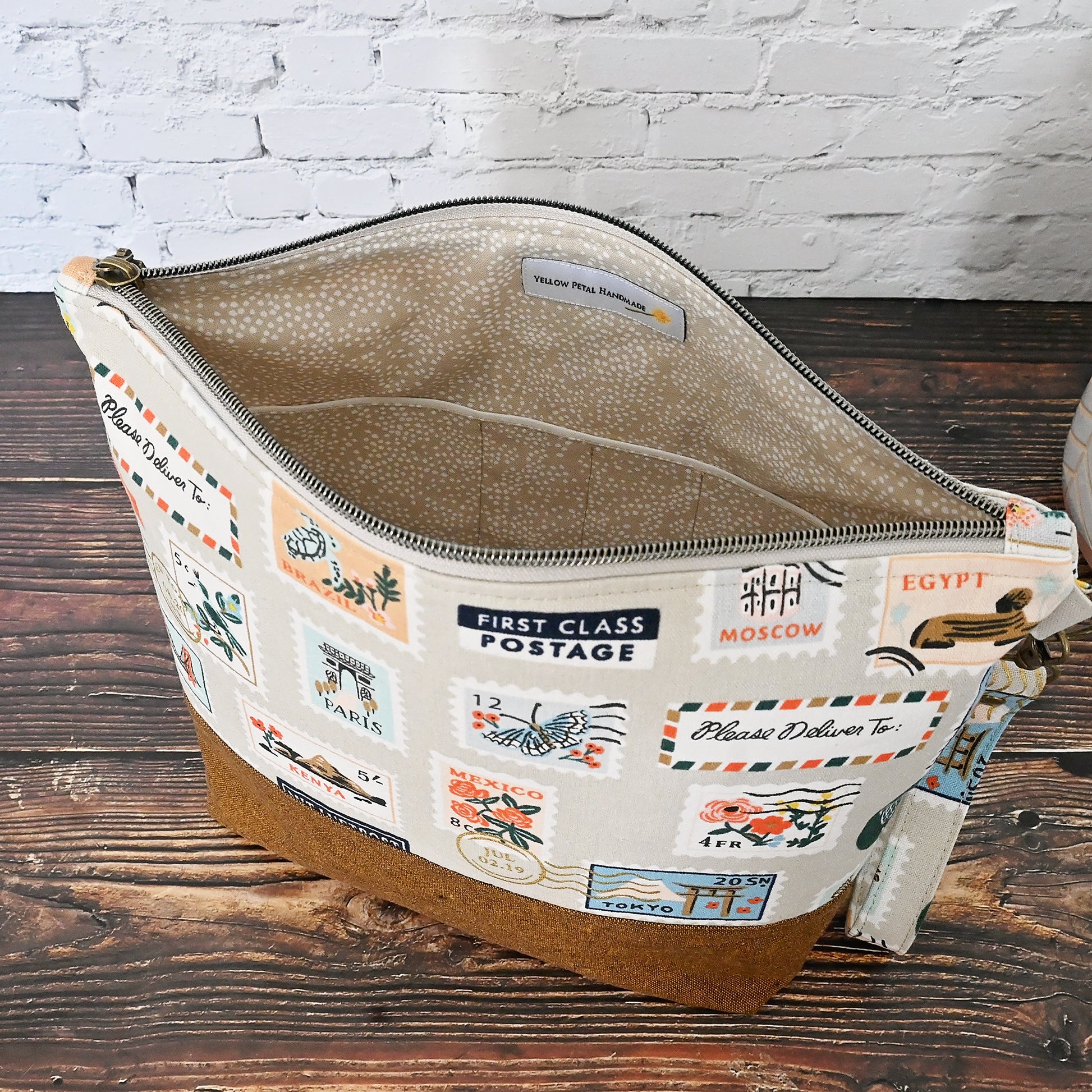 Made from a striking canvas featuring stamps from around the world and metallic gold details and paired with a spice linen.  The interior is a taupe and white cotton print.  The Canvas and lining are both by Rifle Paper Co and the linen is by Robert Kaufman.