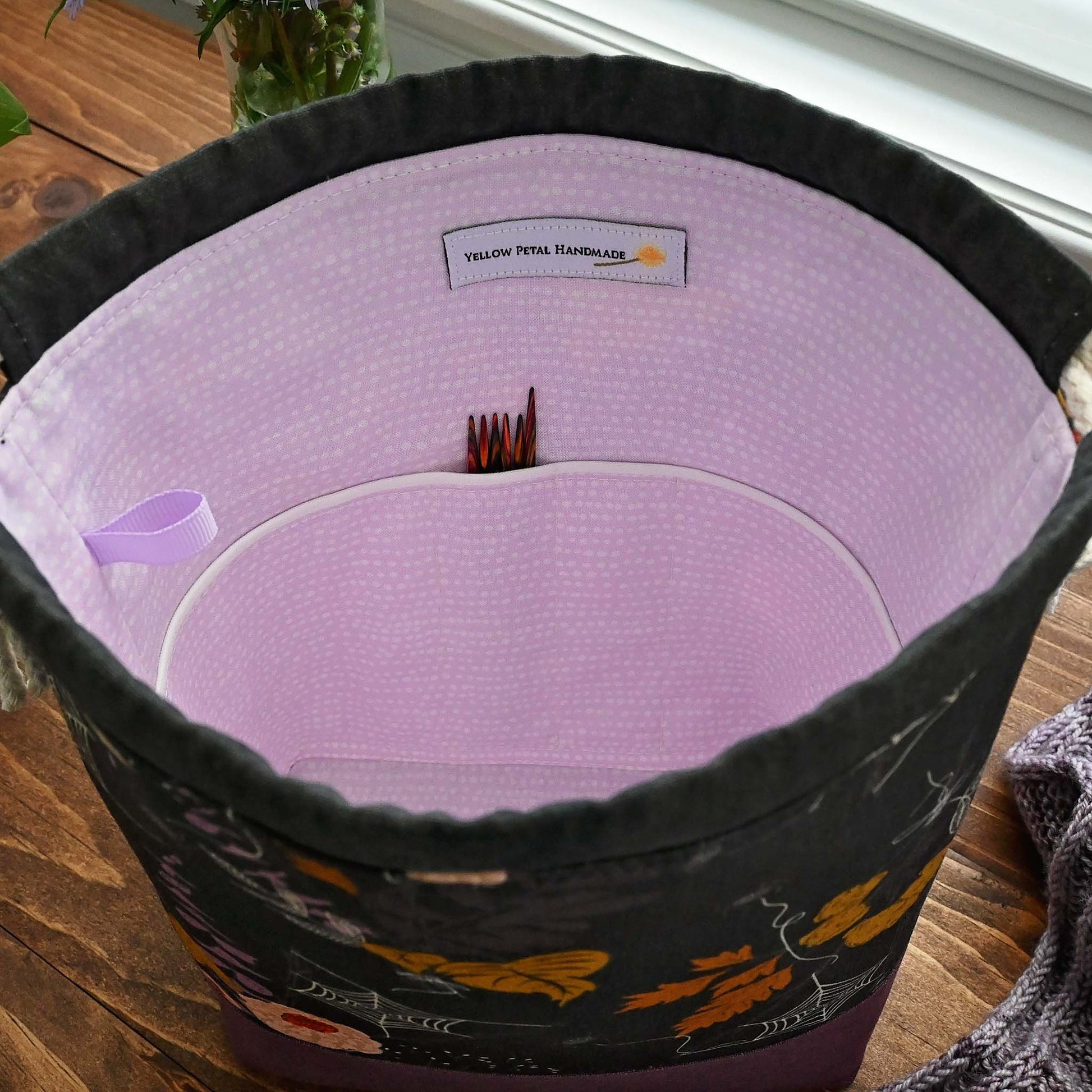 This fun and spooky drawstring project bag is a perfect size for socks or other small projects and is lightly structured to stand alone.  It's made from a Art Gallery Fabric's Cast a Spell collection paired with an eggplant linen.  It's lined in a pretty lilac and white cotton from Dear Stella.