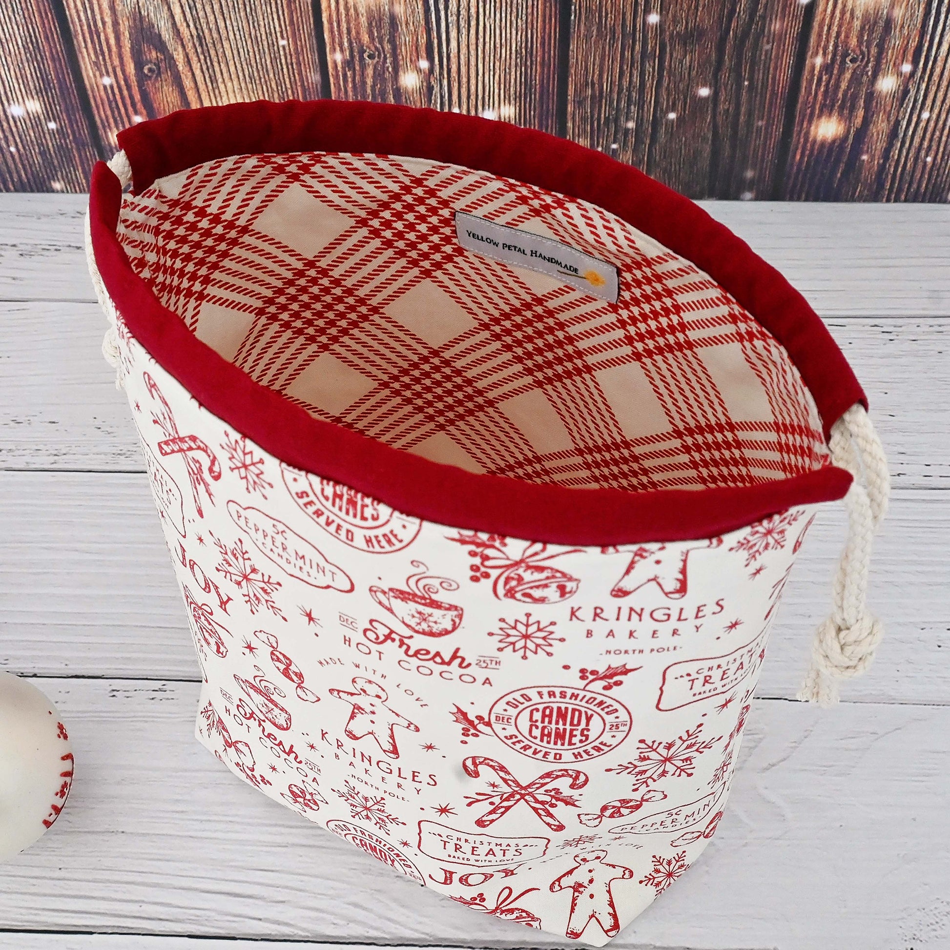 This festive cotton drawstring project bag is a perfect size for socks or other small projects. It's made from a striking red and cream Christmas themed fabric from Riley Blake Designs and is lined in a pretty cream and red plaid from the same collection.