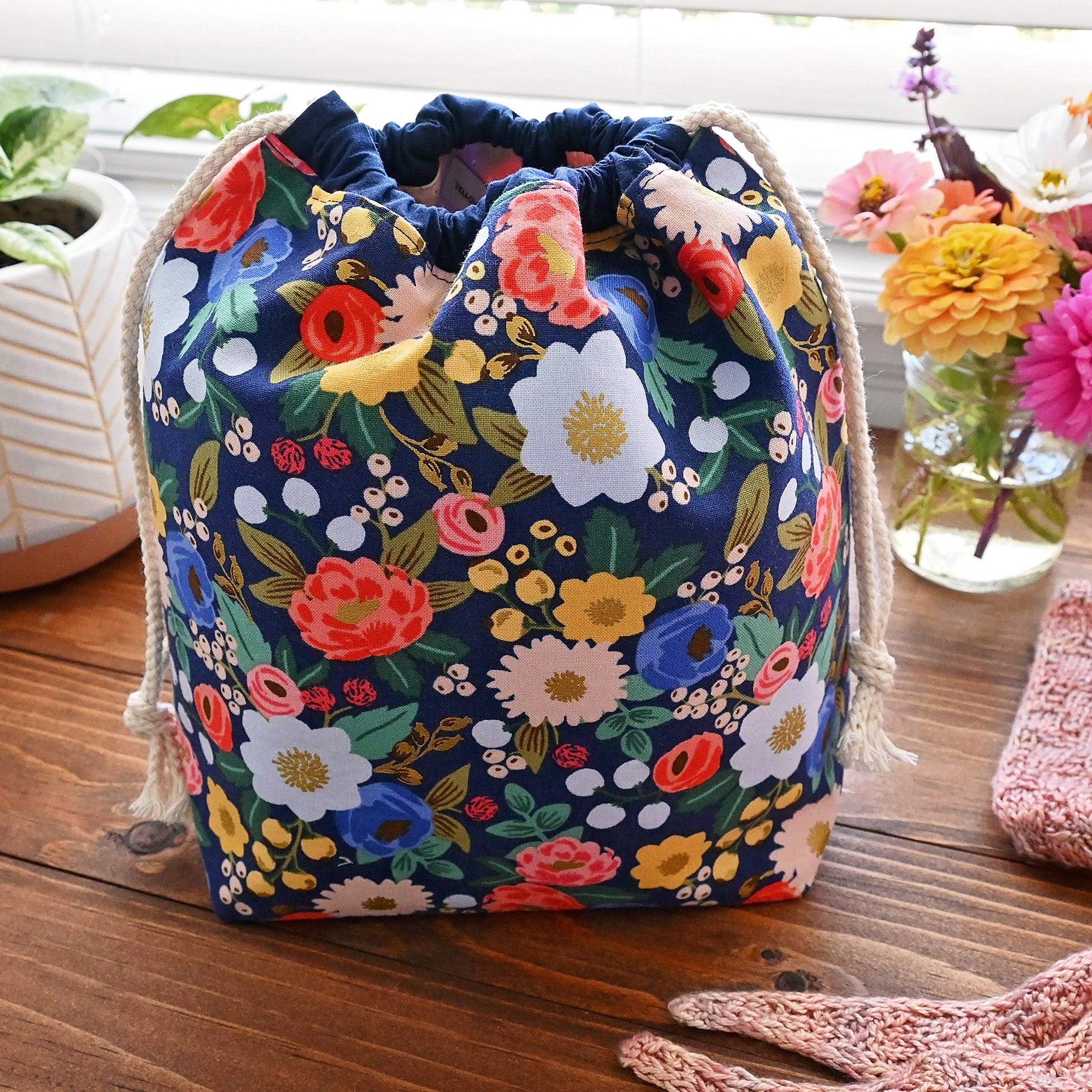 This pretty cotton drawstring project bag is a perfect size for socks or other small projects. It's made from a gorgeous navy floral from the Vintage Garden collection from Rifle Paper Co, and is lined with a pretty blush cotton, also from Rifle Paper. This beautiful bag has metallic gold accents inside and out.