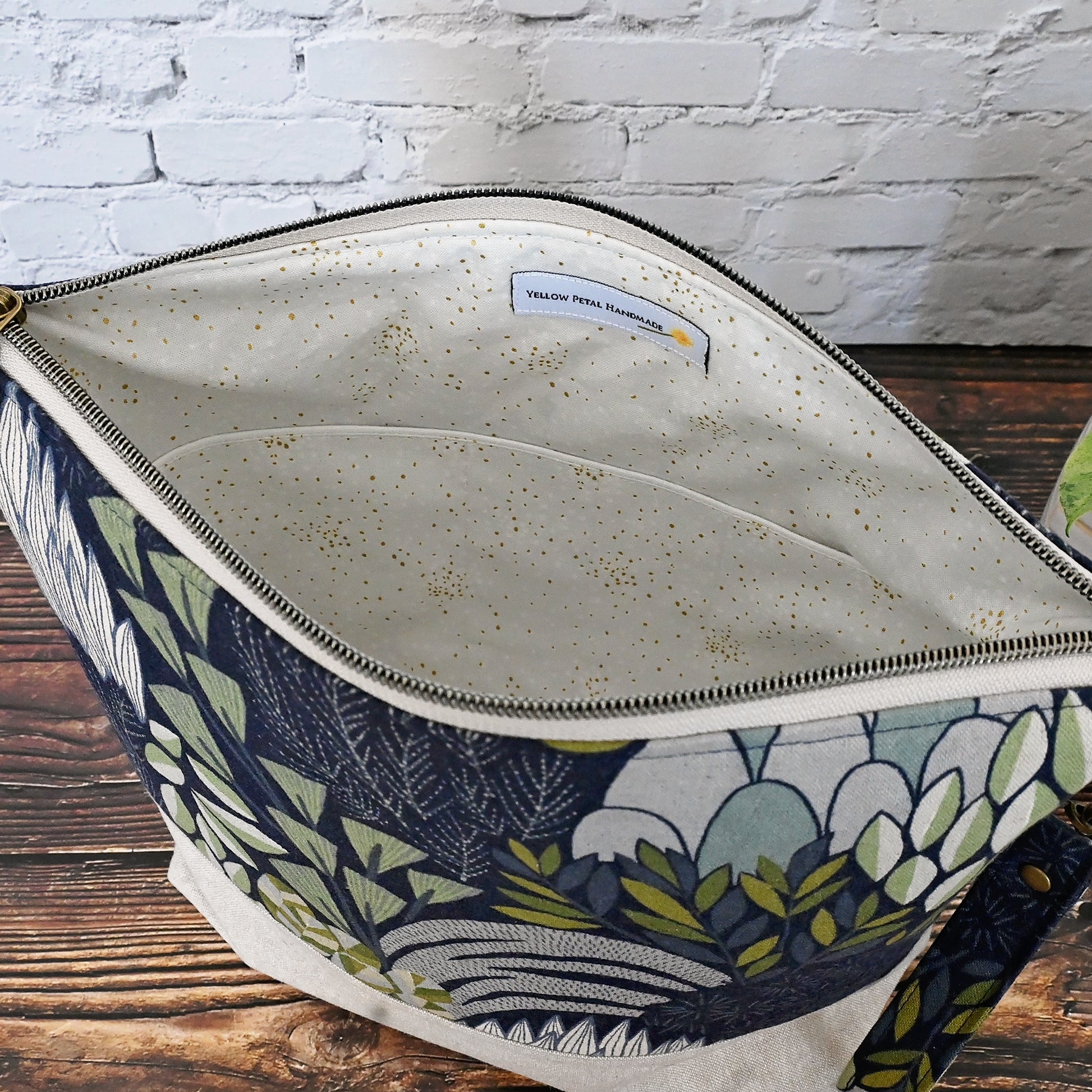 A canvas project bag in a unique blue floral from Kokka Fabrics, a textile manufacturer based in Osaka, Japan. This floral is paired with a flax linen from Robert Kaufman and the interior is a lovely dove grey with gold accents by Rifle Paper Co. It is large enough to easily fit at least two skeins of yarn and is a great size for medium sized projects. It is structured to stand alone and has a zipper closure and a removable wrist strap.