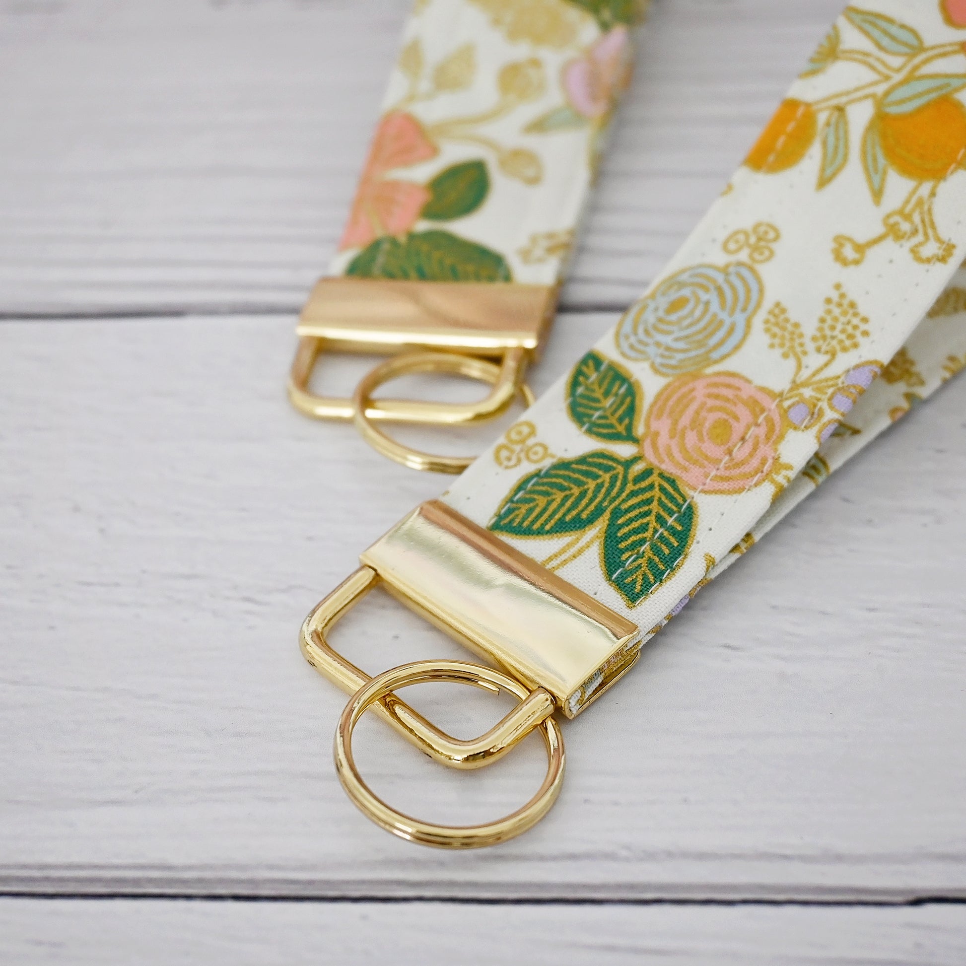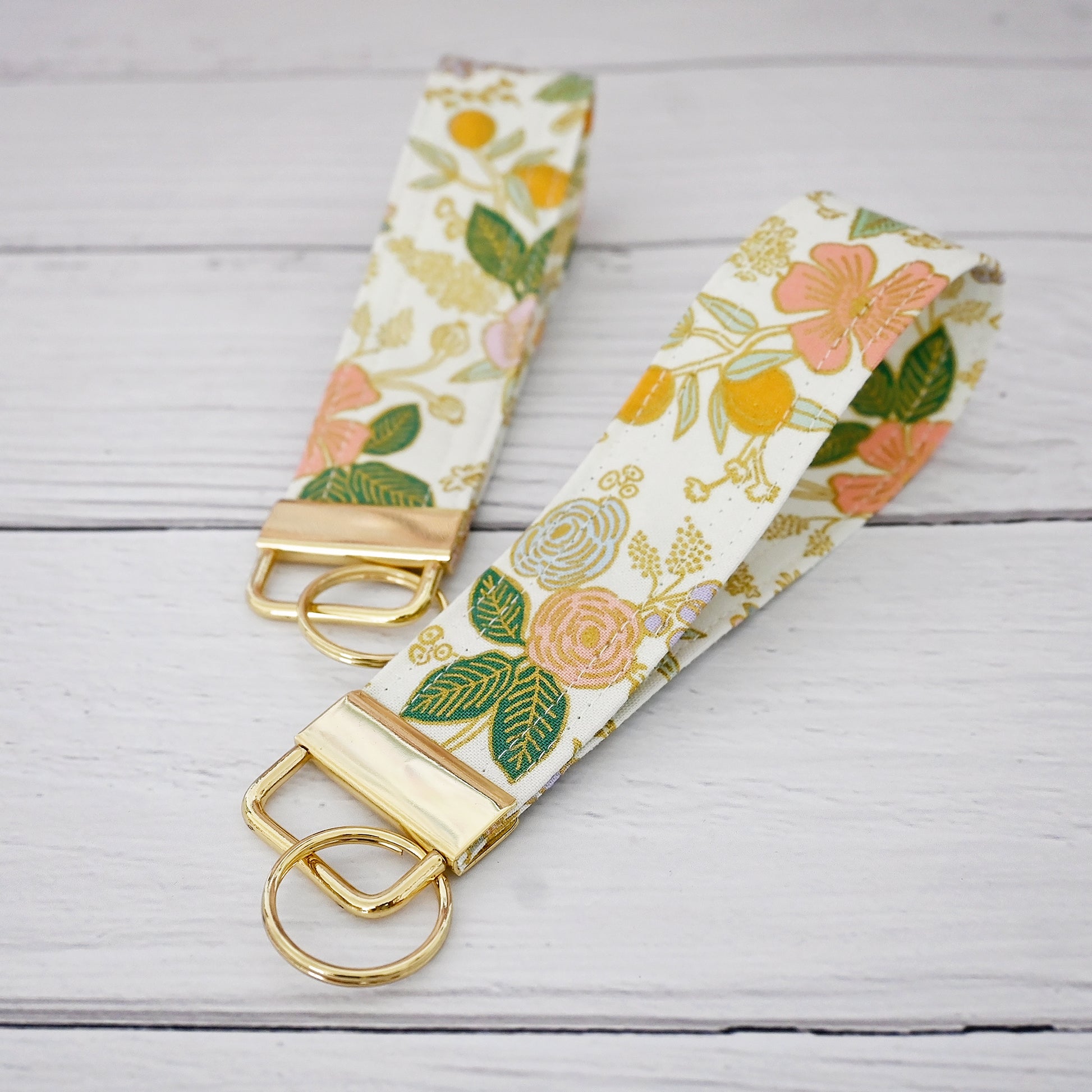 Pretty wristlet keychains available in a lovely cream floral from Rifle Paper Co's Orchard Collection. These keychains are 6" long by 1.25" wide and feature gold hardware. Fully reinforced for durability, these key fob wristlets are perfect for keeping your hands free while carrying your keys