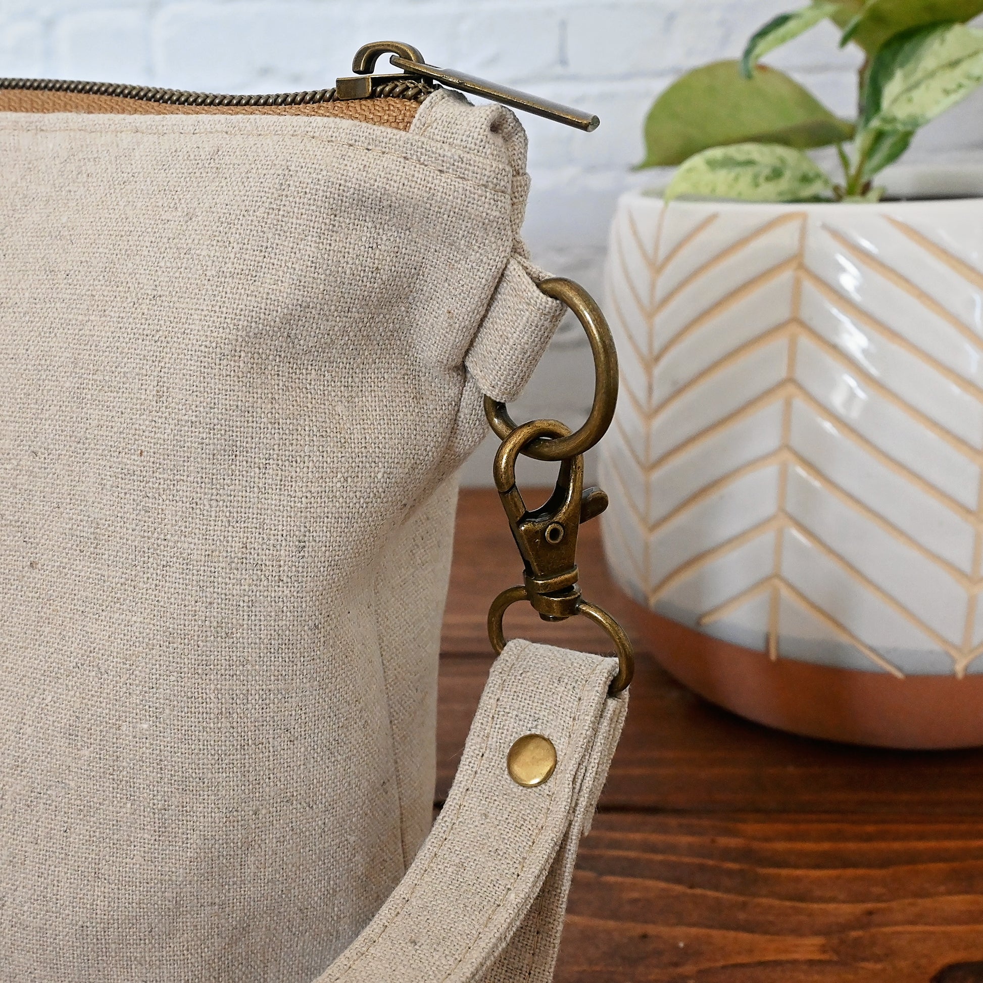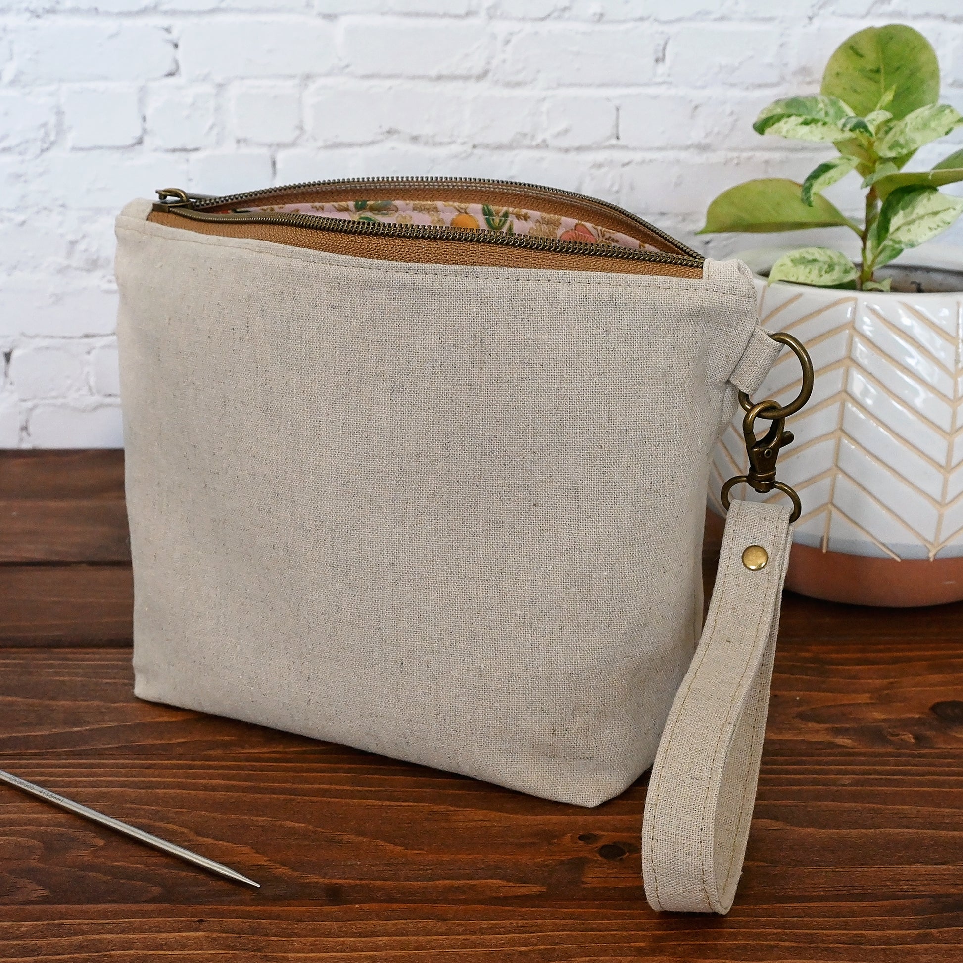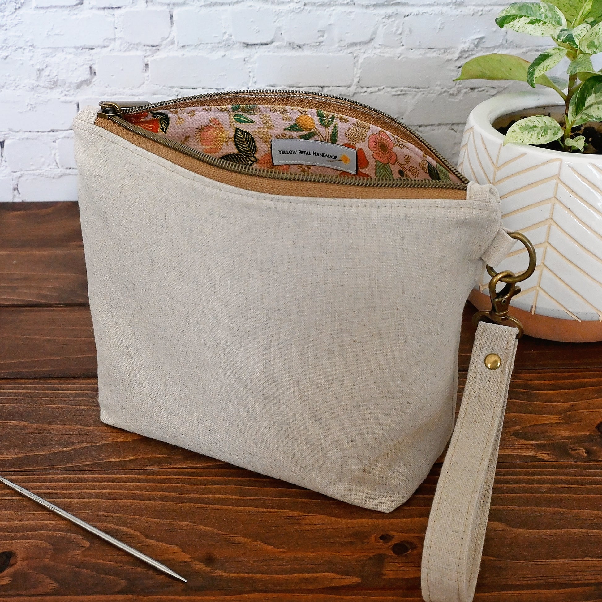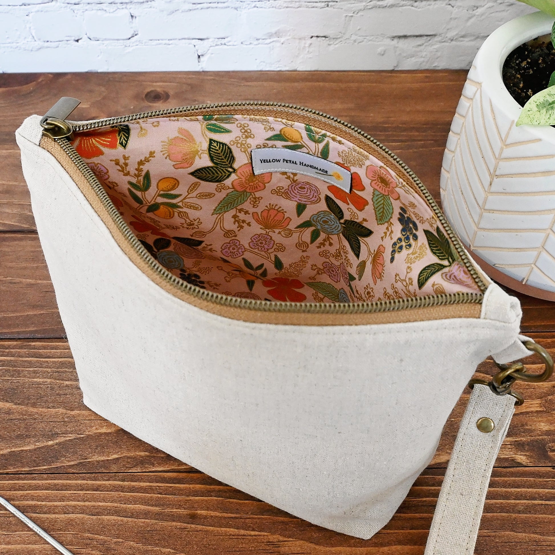 A natural canvas sock pouch with a pretty pink floral lining.  Perfect if you love a subtle, classic bag with an eye catching interior.  This pouch is lightly reinforced, and it comes with a detachable strap for easy on-the-go use.