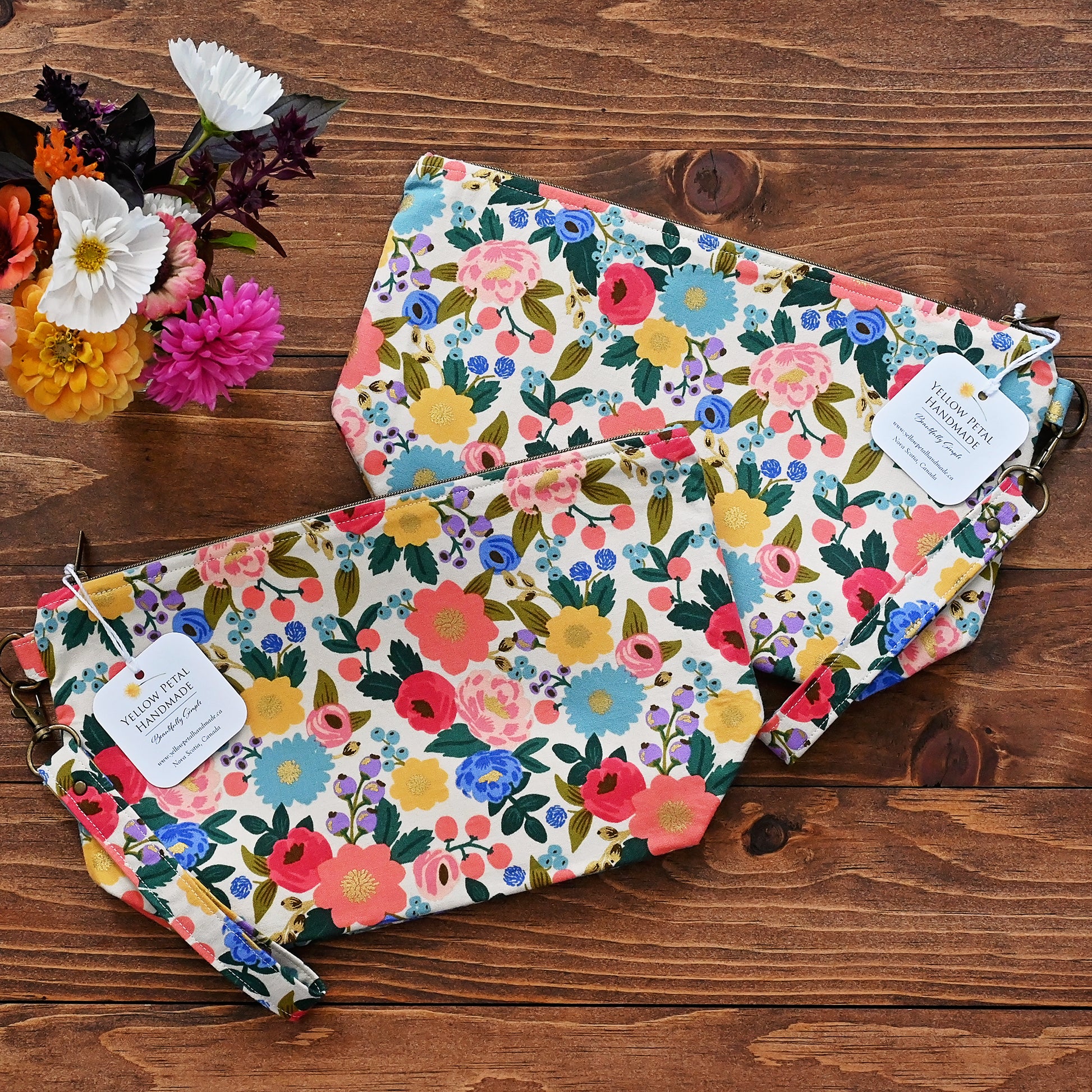 This bag is made from Rifle Paper Co's Vintage Garden collection and is lined with a pink and gold cotton from Riley Blake Fabrics. 100% cotton.