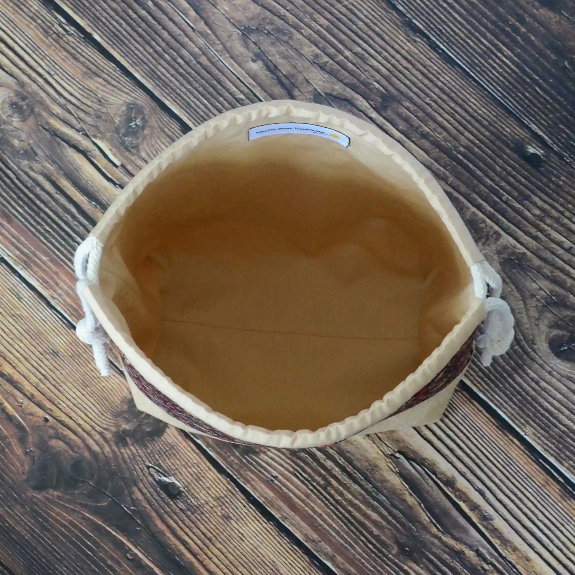 Made from the Fleuron Haven fabric collection by Art Gallery Fabrics and paired with a linen from Robert Kaufman's Essex collection. The interiors are made from caramel coloured cotton, also from Art Gallery Fabrics.