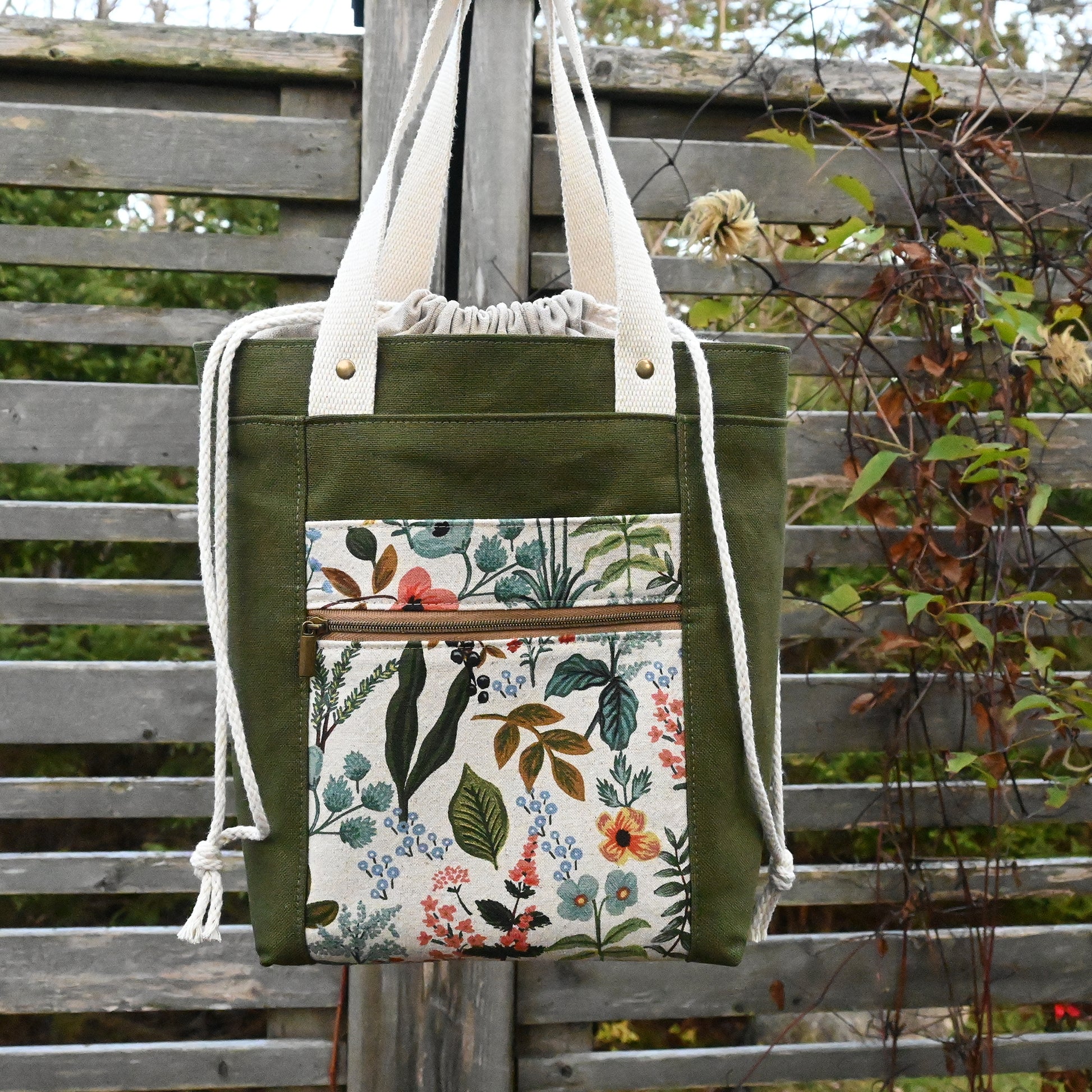 This small tote was thoughtfully made from a sturdy green cotton canvas and paired with a beautiful Amalfi canvas from Rifle Paper Co, and tote features tons of storage options, inside and out.
