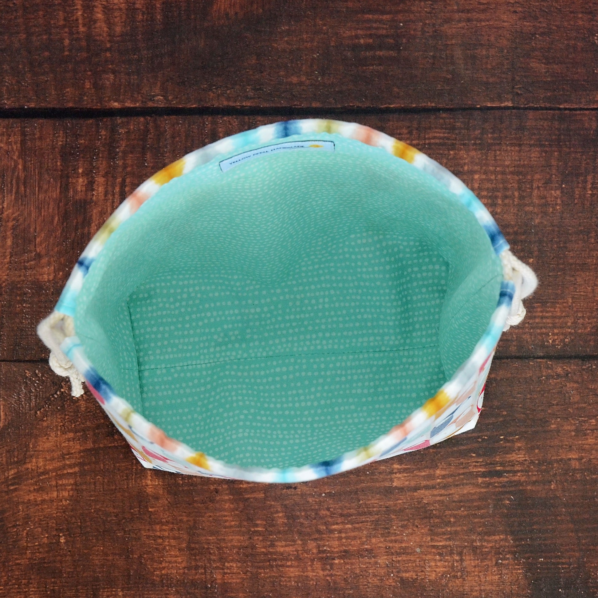 This eye catching drawstring project bag is made from the Poppy Pop collection by Scion fabrics and features a Scandinavian inspired geometric owl print. This bag is lined in a pretty aqua and white dotty fabric from Dear Stella fabrics. This small bag is a perfect size for sock projects.
