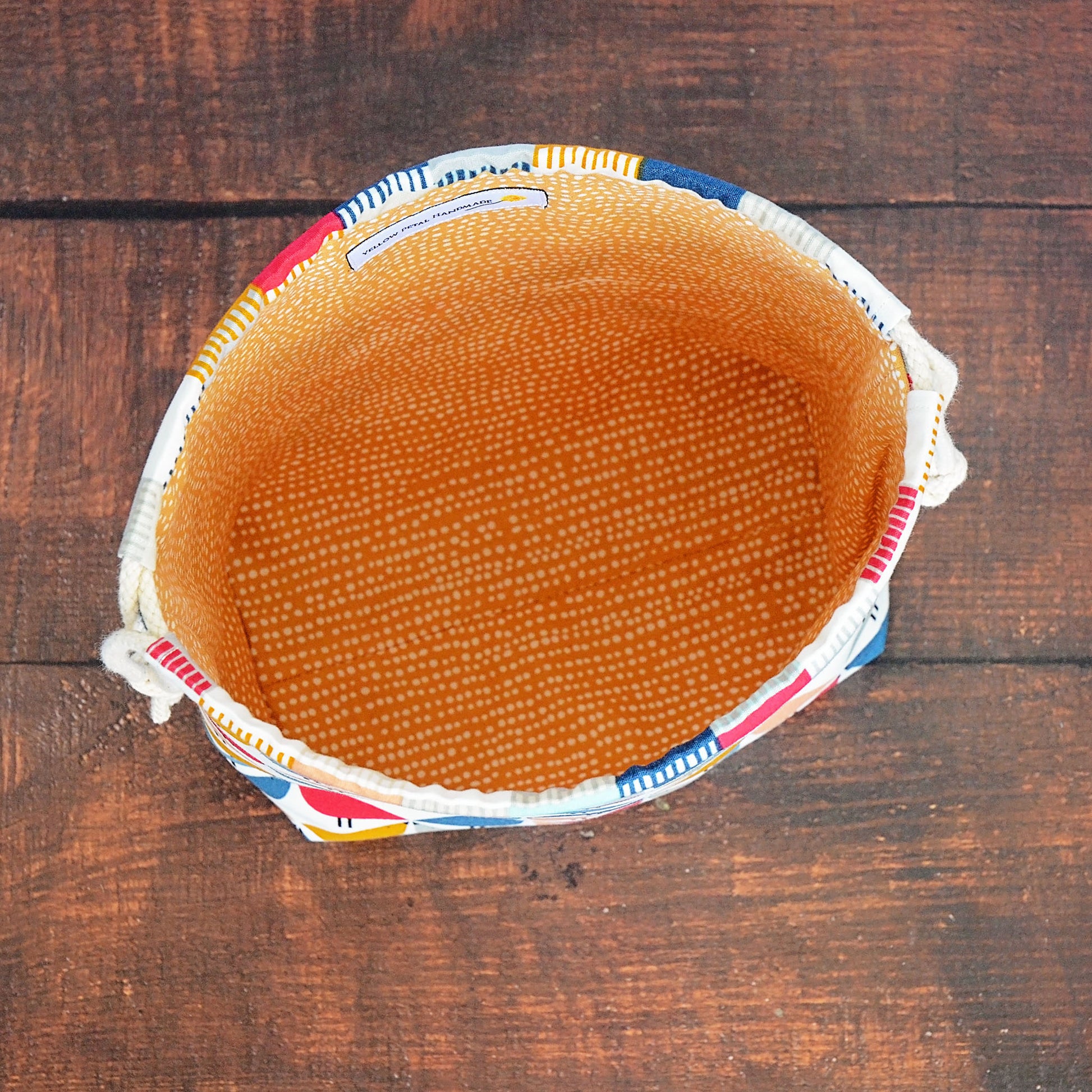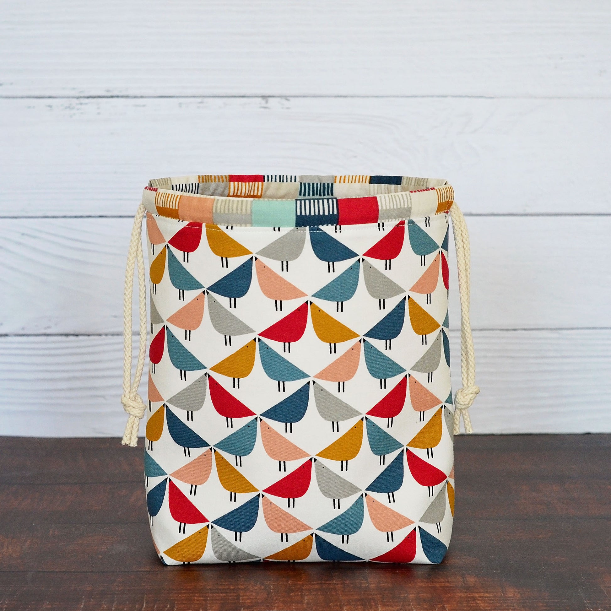 This eye catching drawstring project bag is made from the Poppy Pop collection by Scion fabrics and features a Scandinavian inspired geometric bird print.  This bag is lined in a pretty gold and white dotty fabric from Dear Stella fabrics.  This small bag is a perfect size for sock projects.