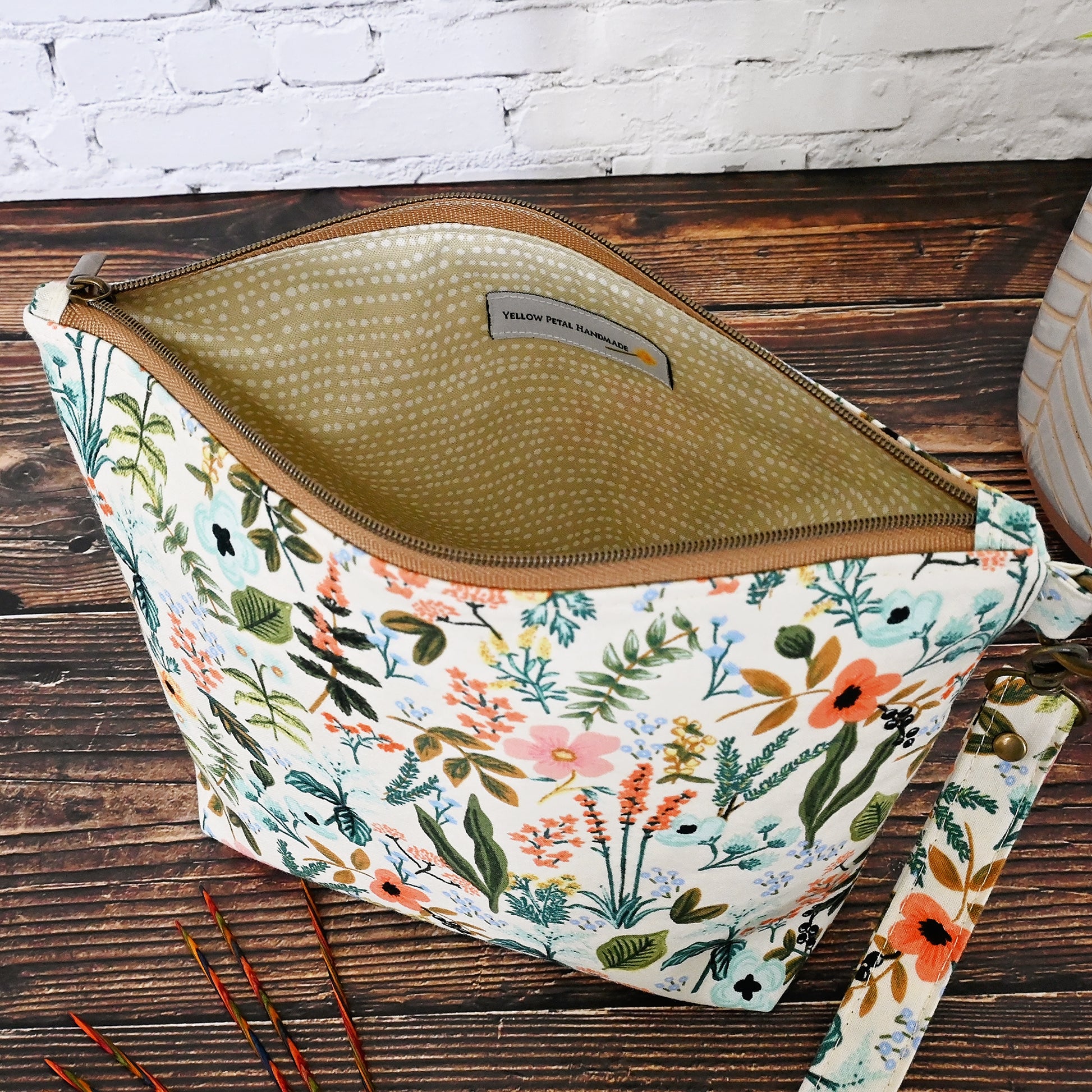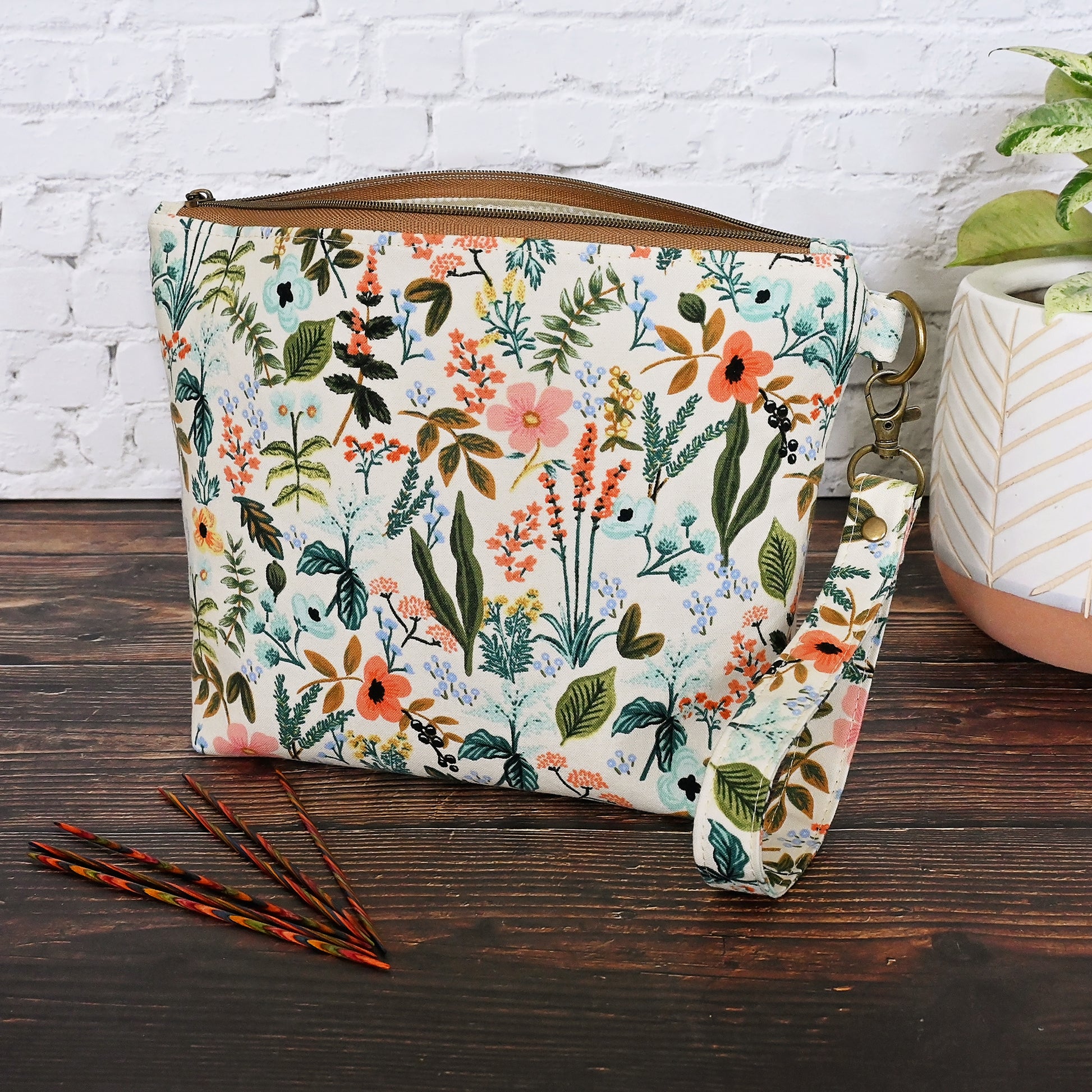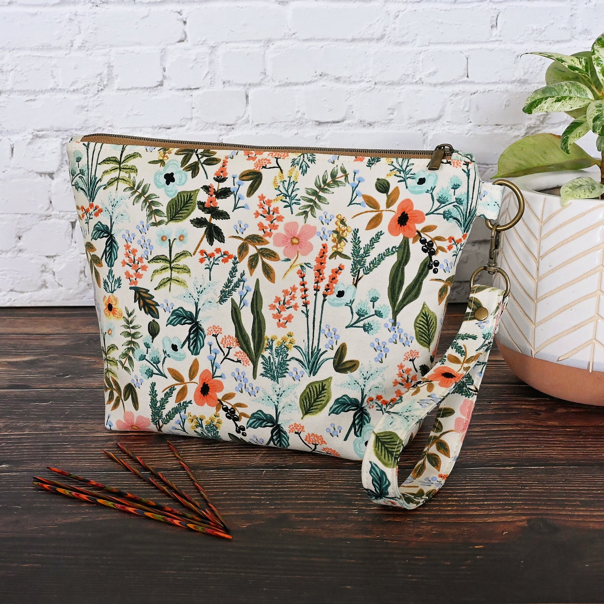 This pretty project bag is made from a cream floral cotton and is lined with a soft green cotton with small white dots. Perfect for socks or other small projects, but you could also use this bag for pretty much anything! It features a removable strap and doesn't have any pockets, making it a great 'stow and go' bag.
