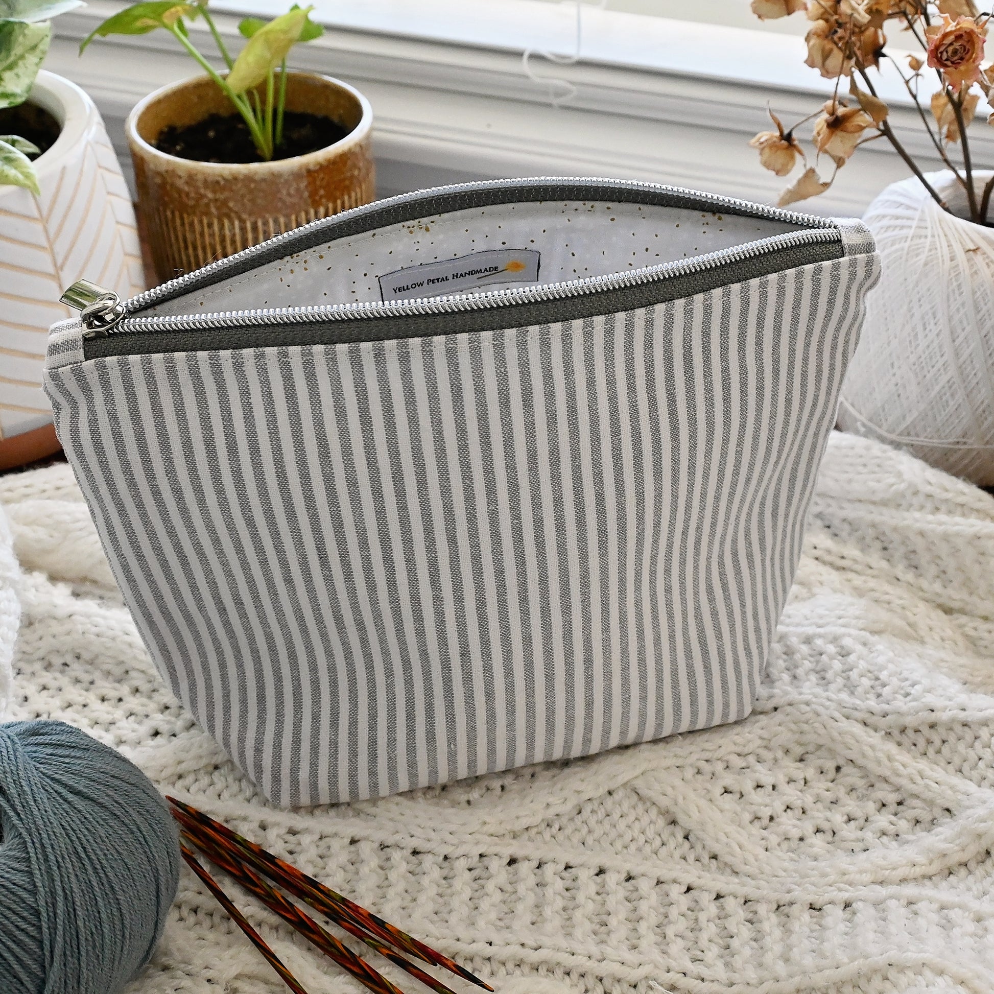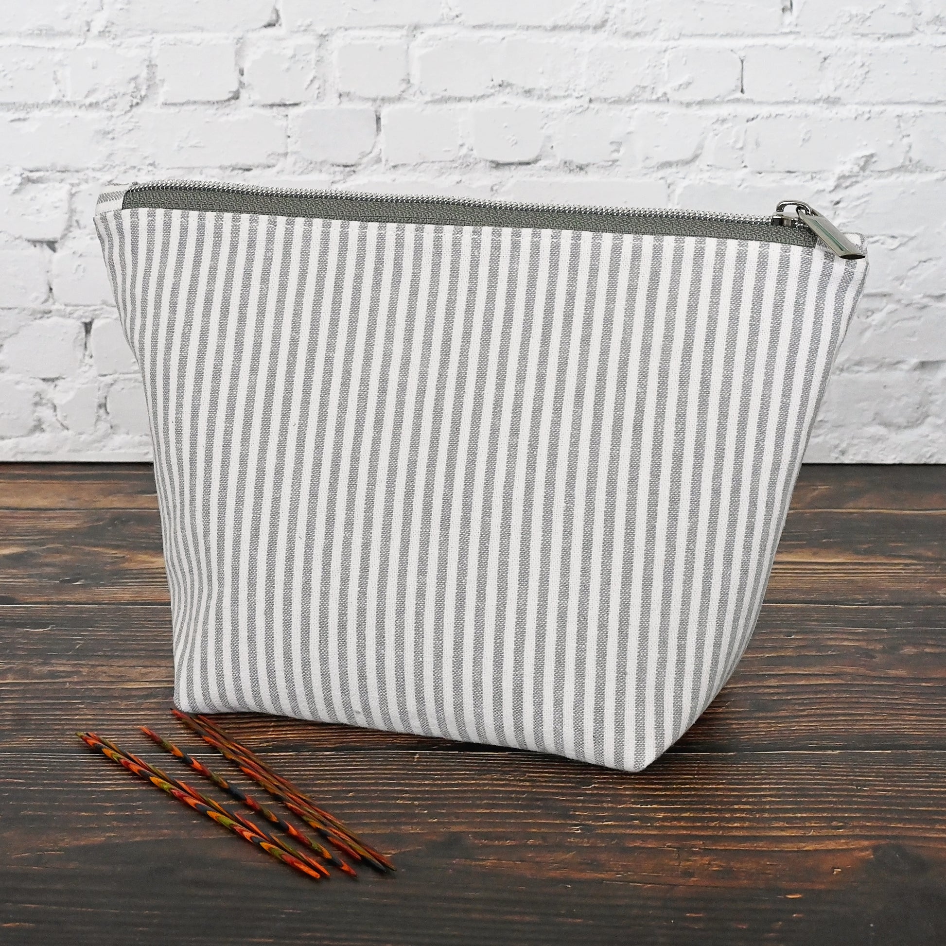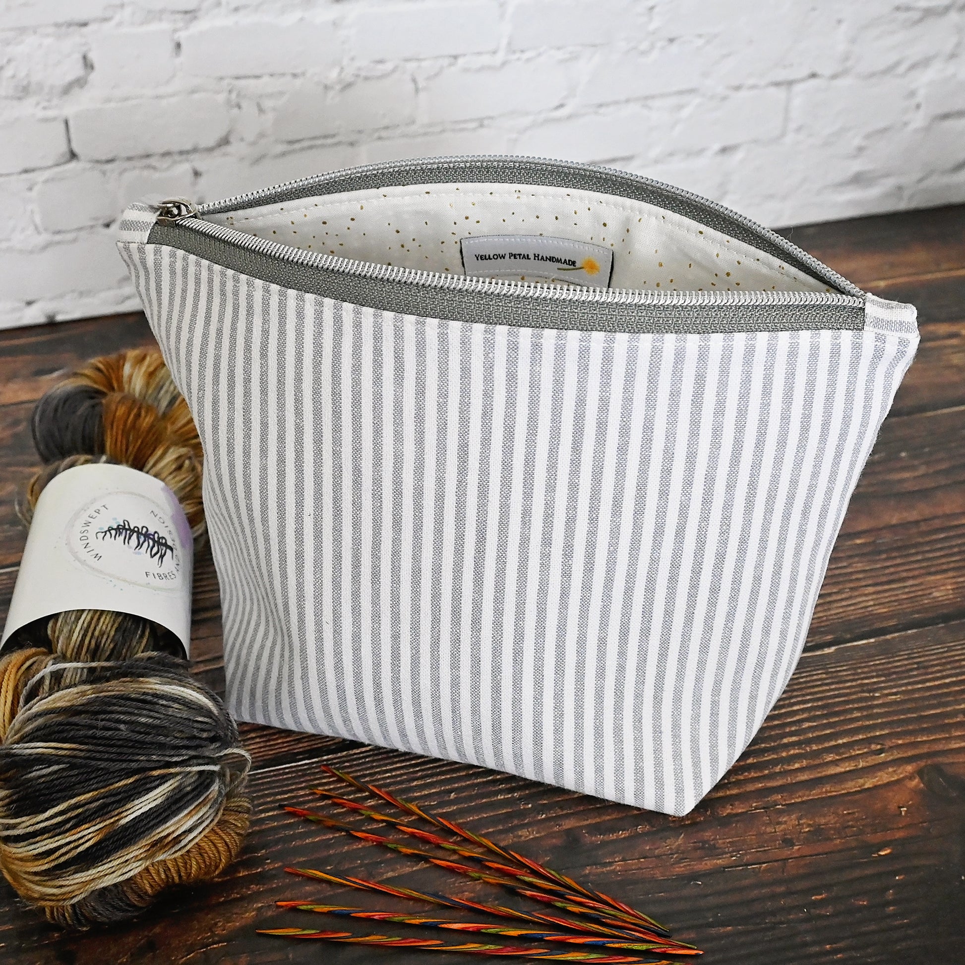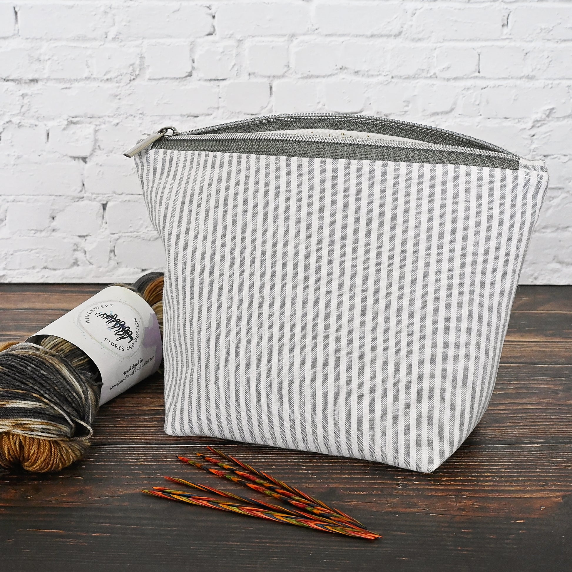 A grey and white canvas sock pouch with a neutral dove grey and gold lining. Perfect if you love a subtle, classic project bag. This pouch is lightly reinforced to stand alone. It closes with a lovely silver and grey zipper.