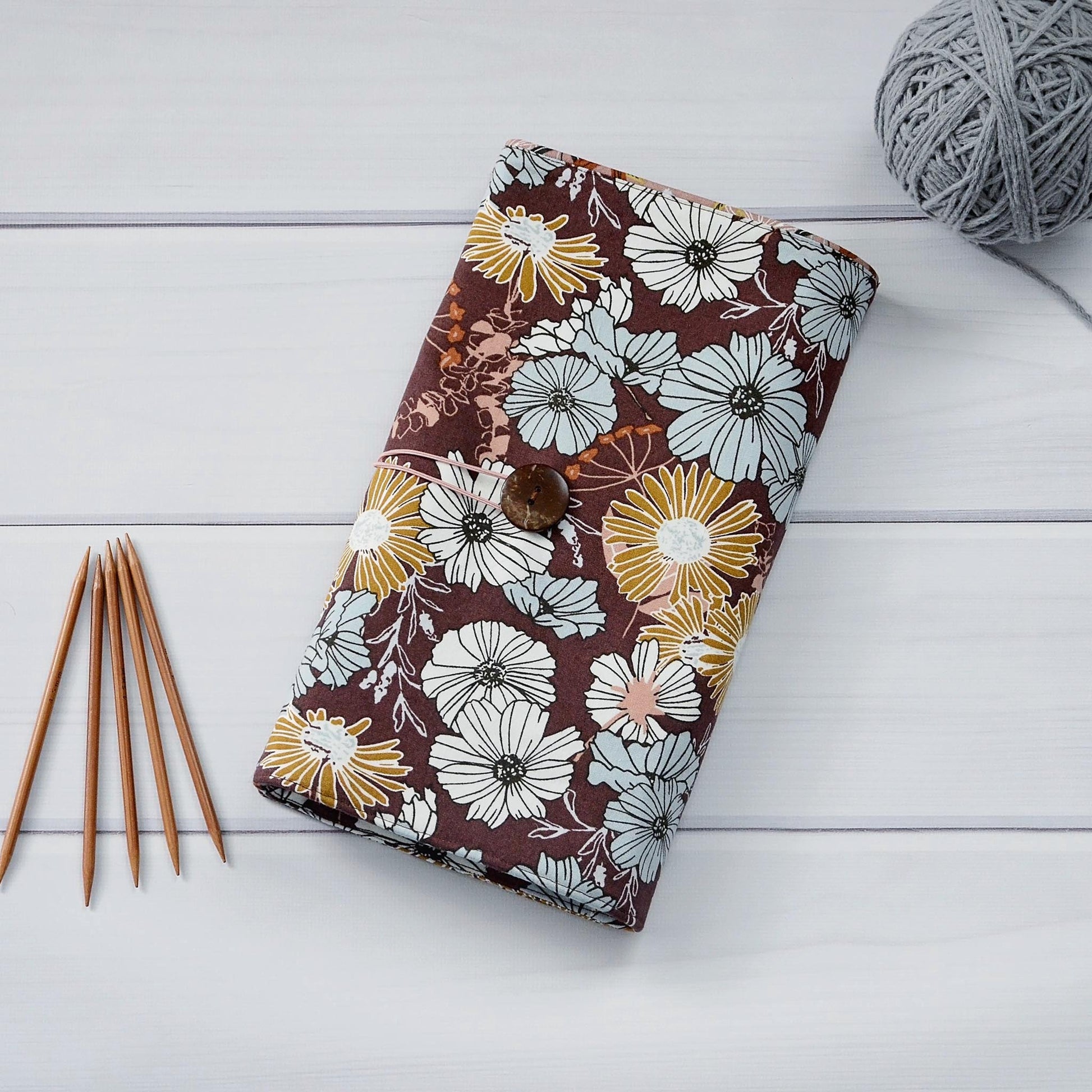 This tri-fold needle wrap has multiple slip pockets of different sizes for DPN needles and circular needles or other accessories. This case folds closed and secures with an elastic and button closure. There is a flap at the top of the wrap to secure needles so they don't fall out when being transported.