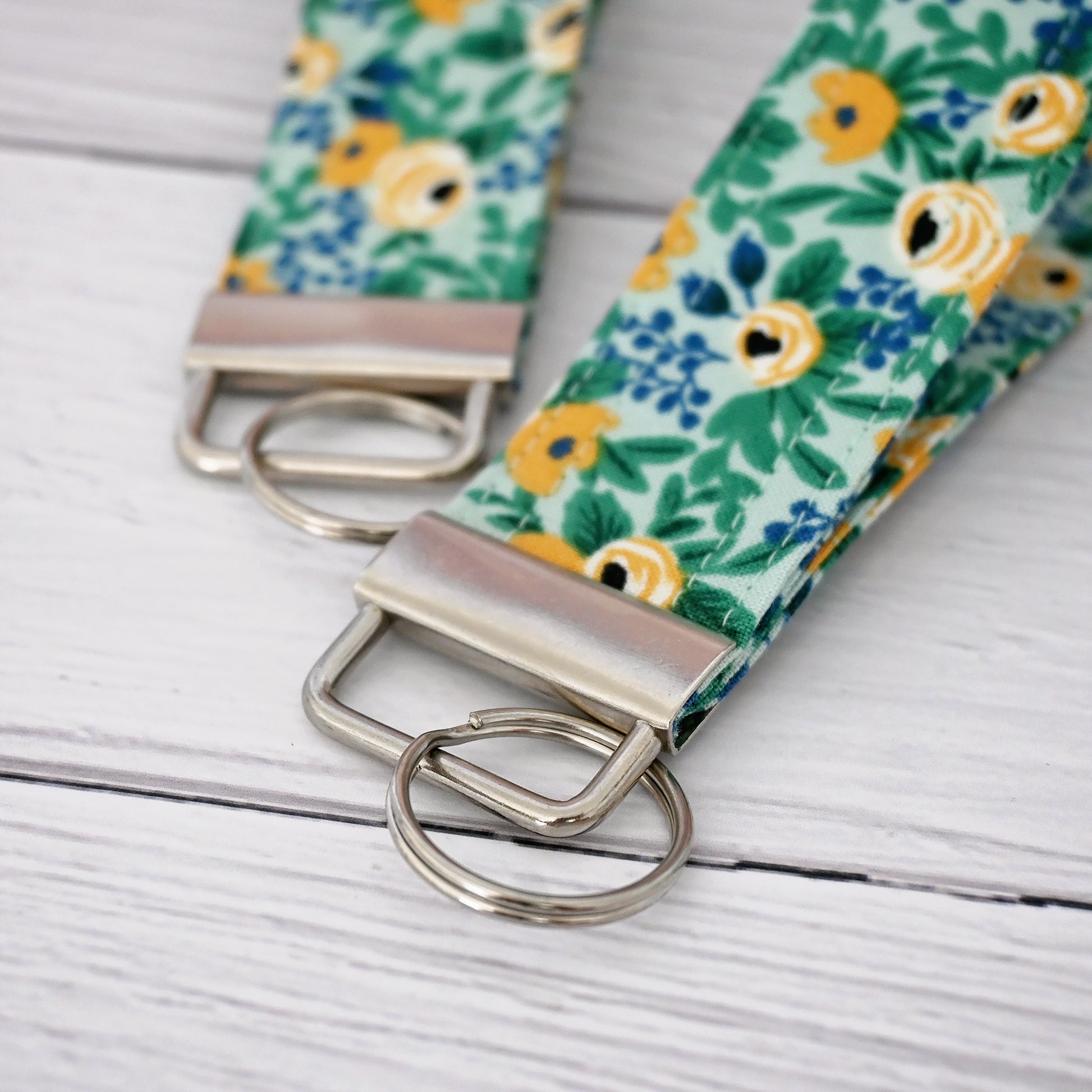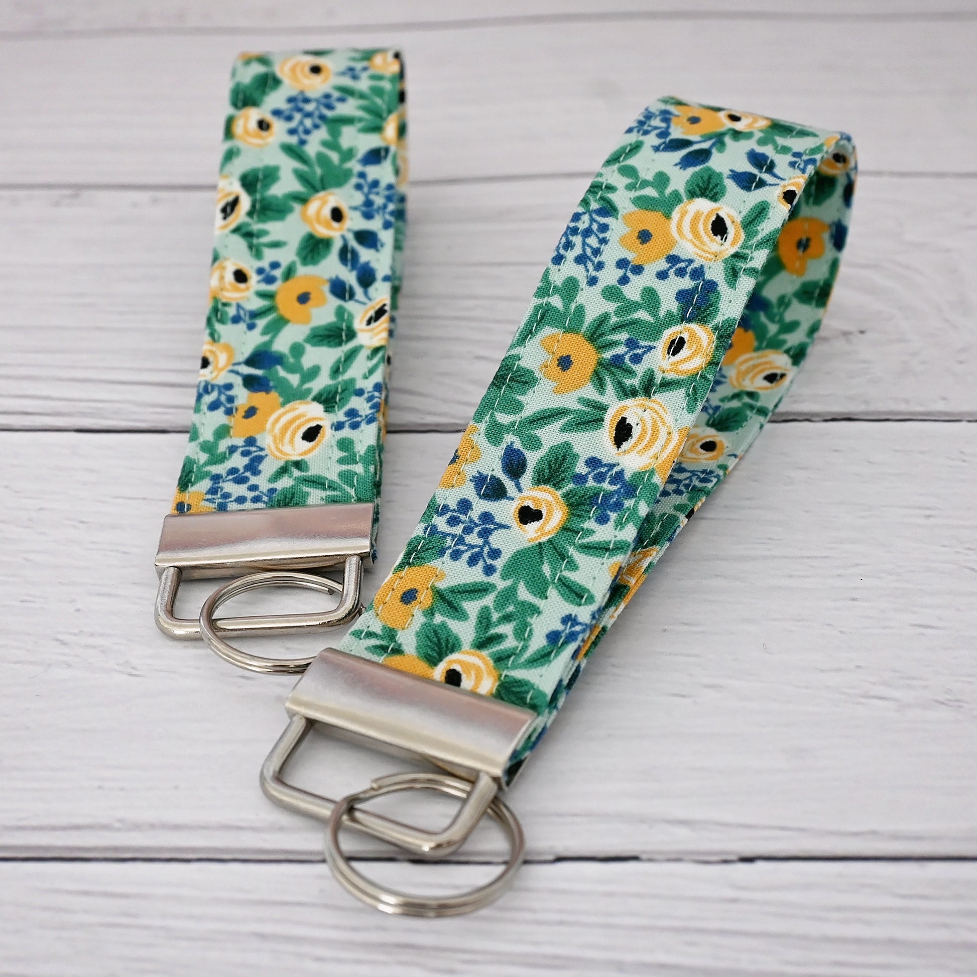Pretty wristlet keychains available in a pretty yellow and green rosa from Rifle Paper Co's. These keychains are 6" long by 1.25" wide and feature gold hardware. Fully reinforced for durability, these key fob wristlets are perfect for keeping your hands free while carrying your keys